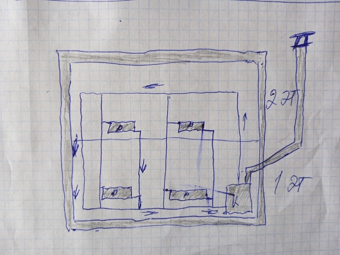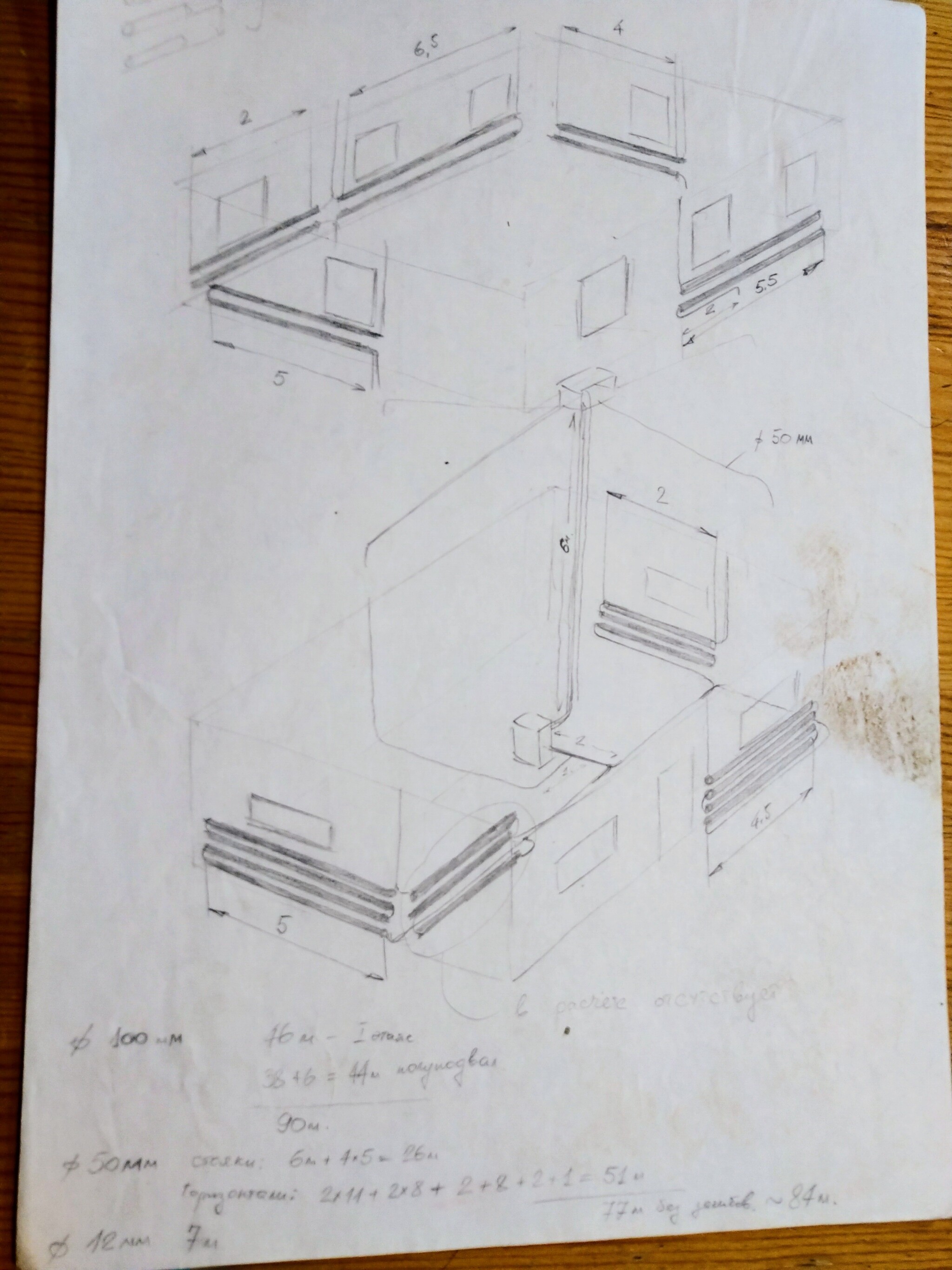 Систему планирую двухтрубную, разделенную на две ветки. Разгонную и обвязку котла делать 69 трубой, далее переходить в 50ю, вся обратка 32й. Отводы к радиаторам 20й.