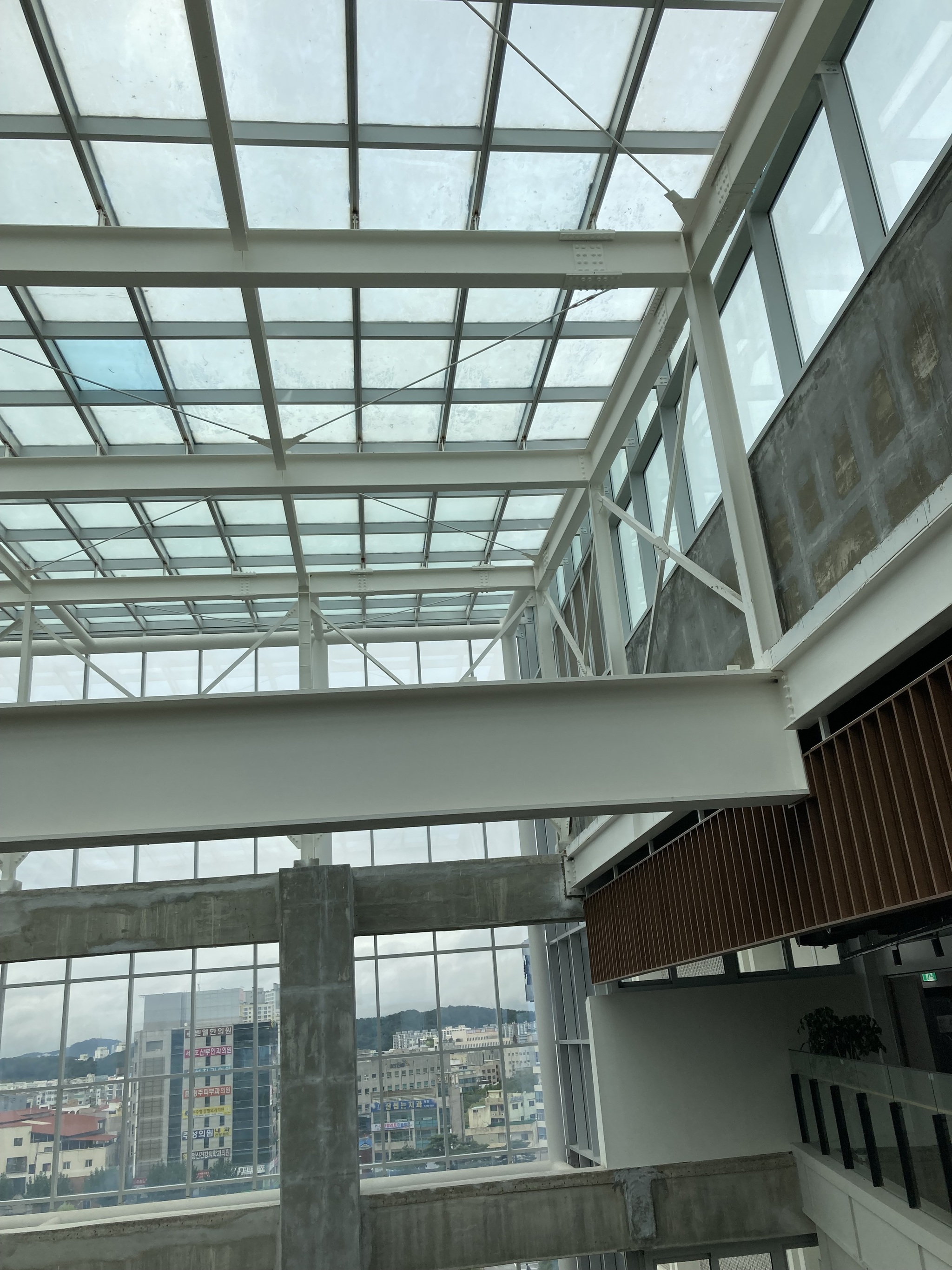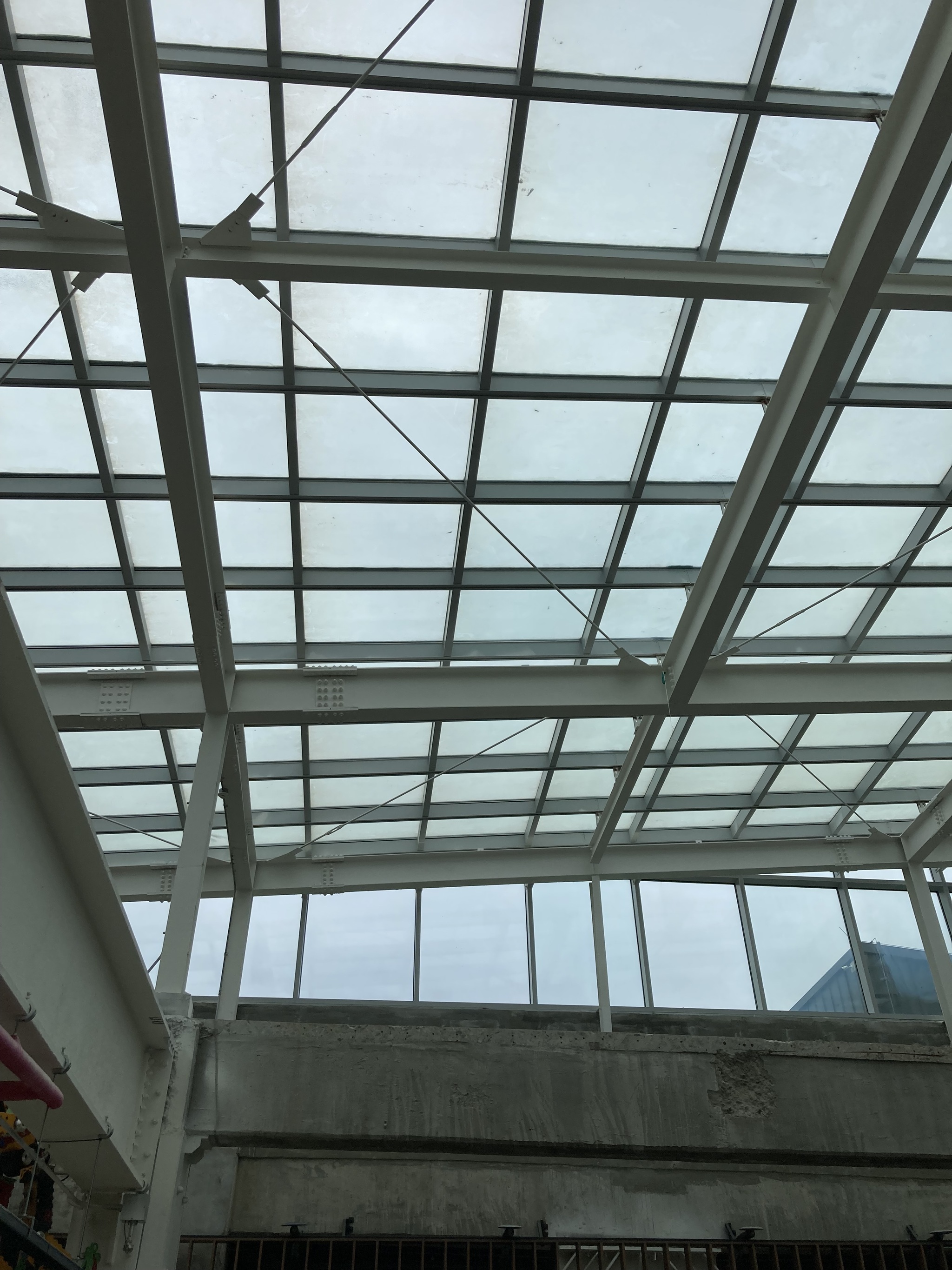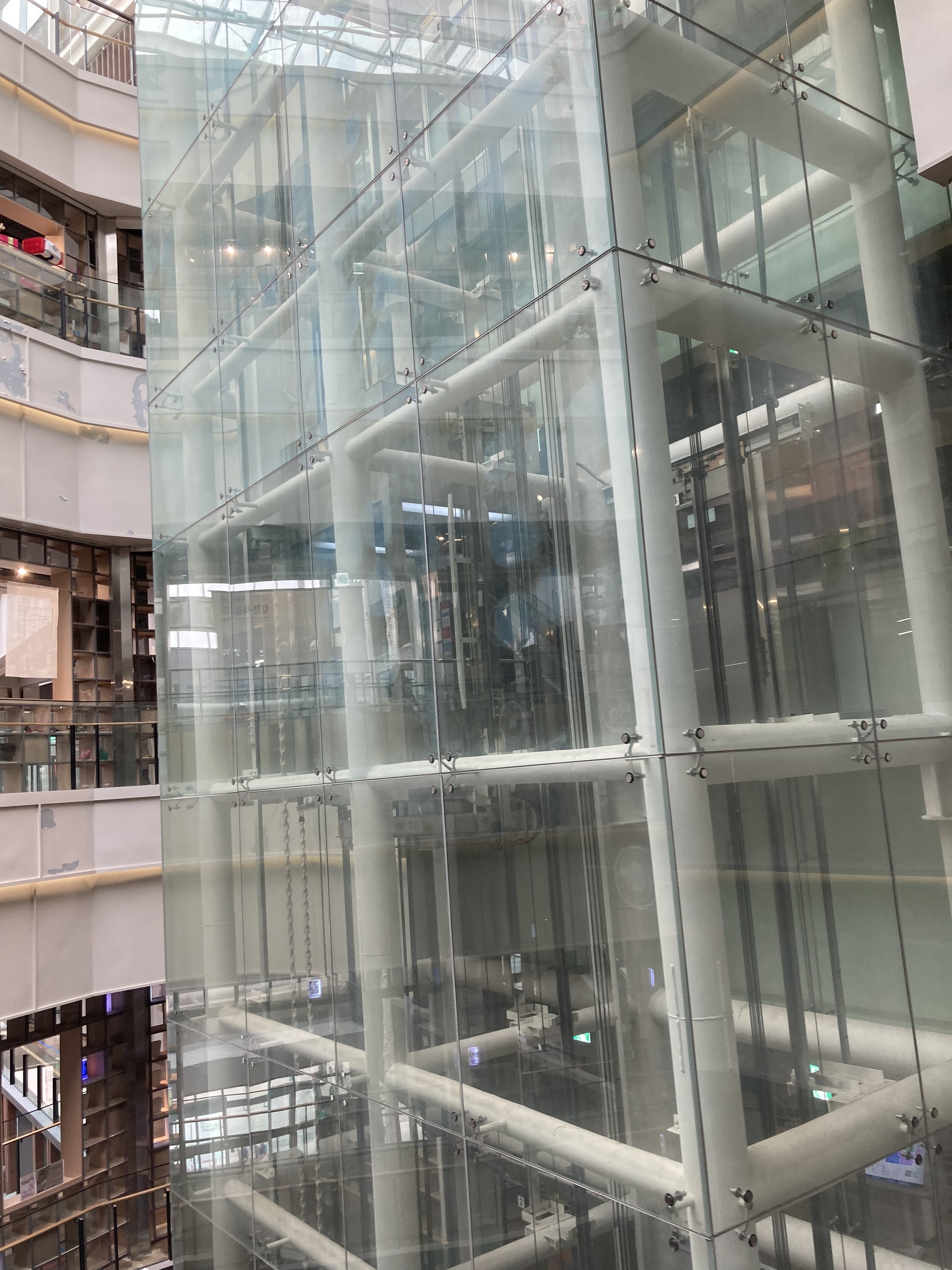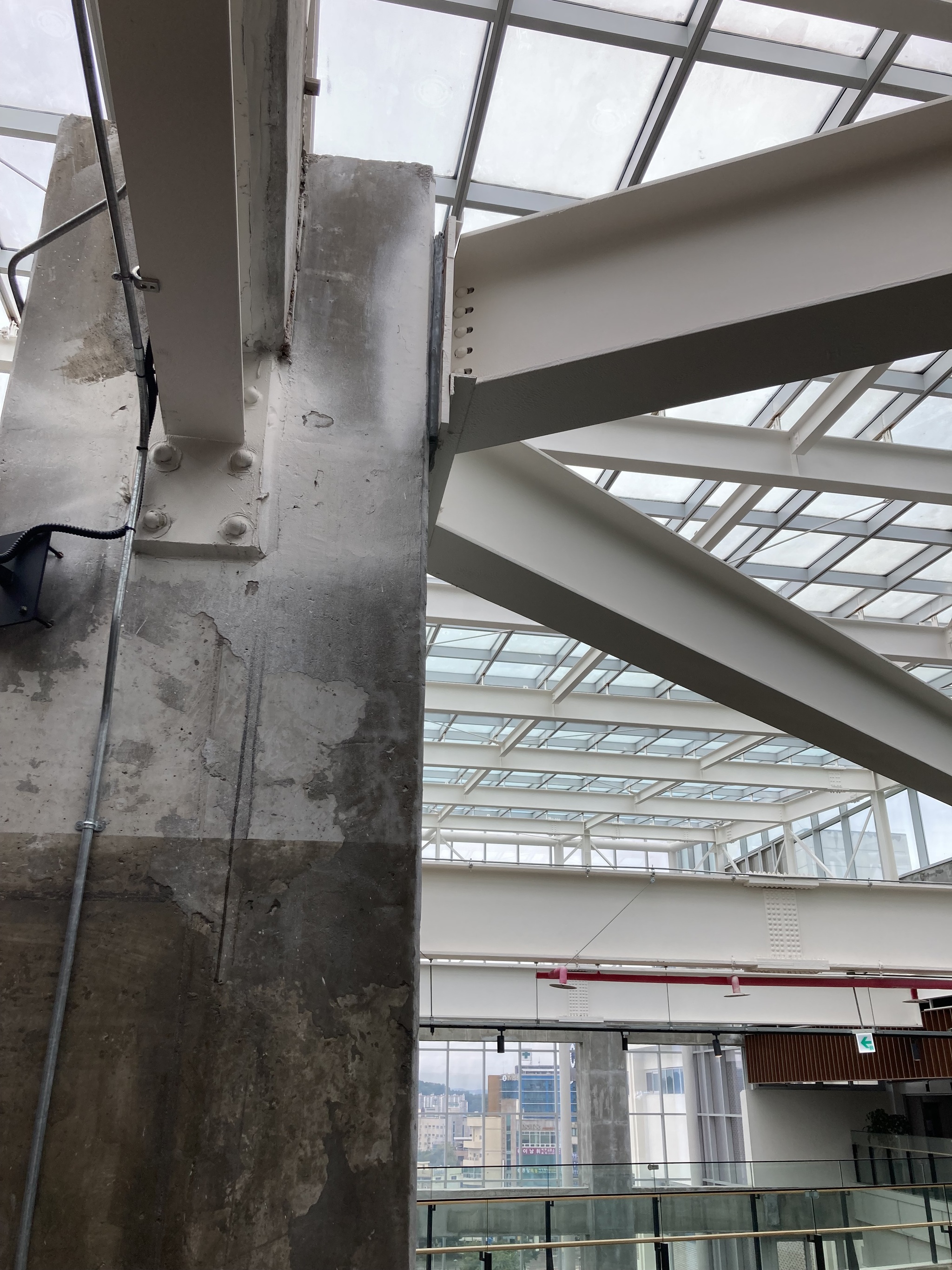 Ниже ядро жесткости- лифтовая шахта из стальных труб, огражденная стеклом. Стекло можно было не ставить))