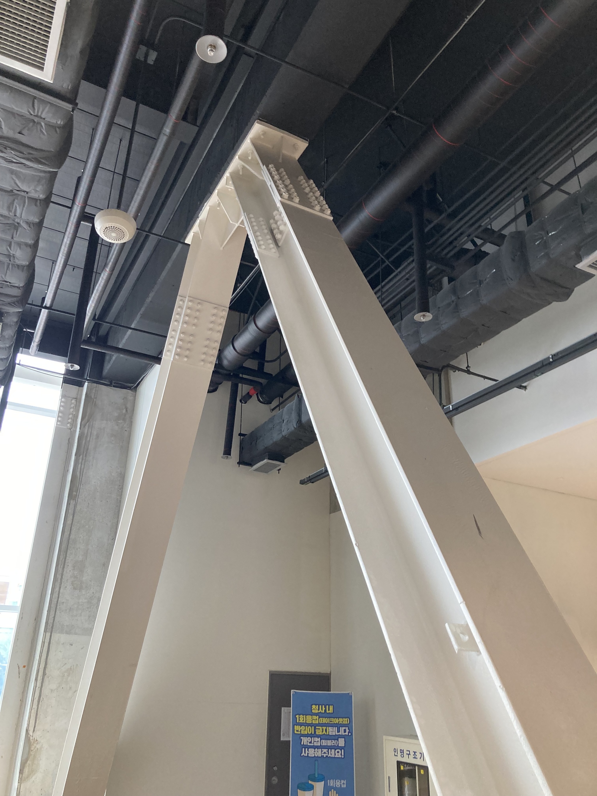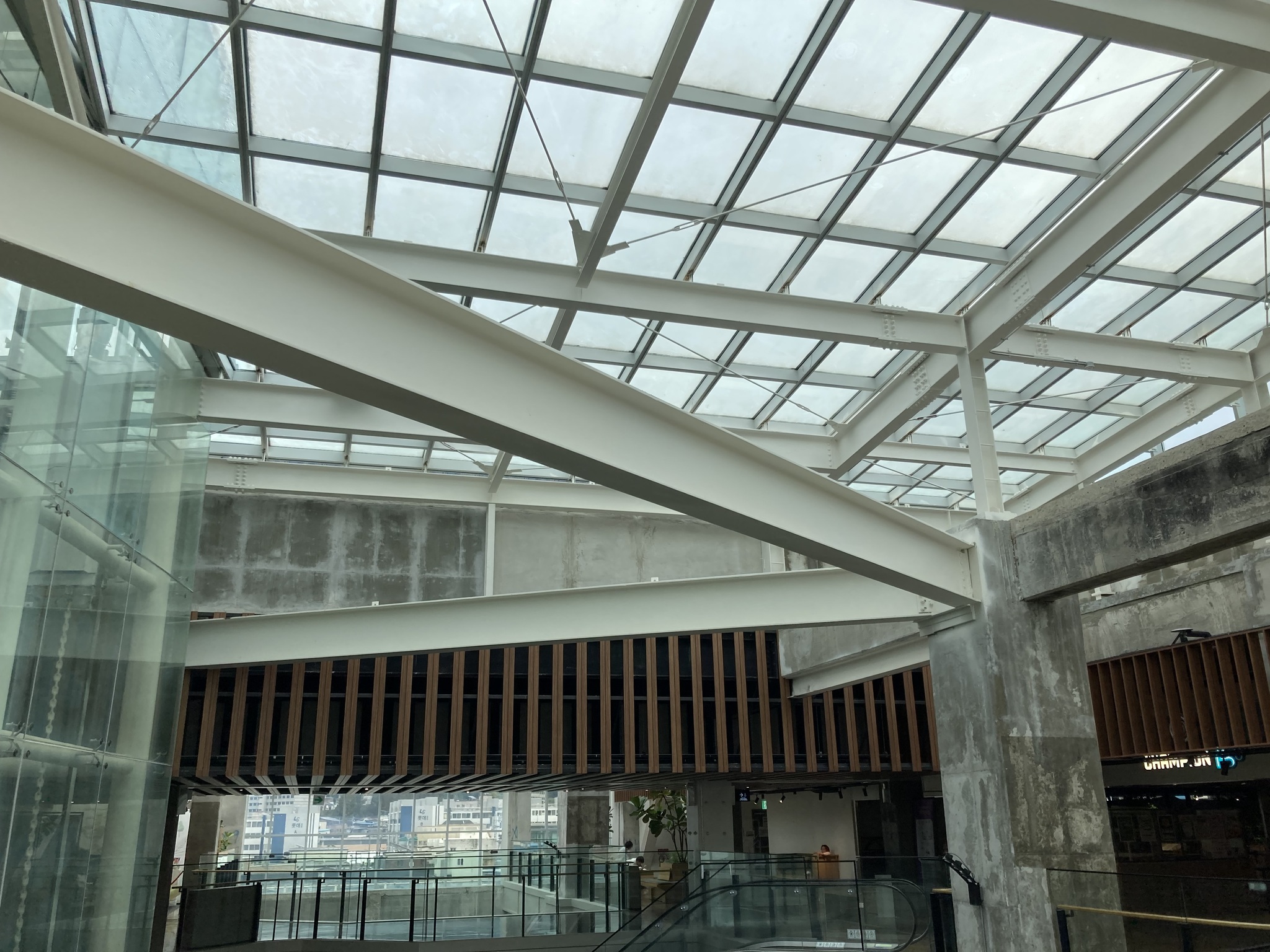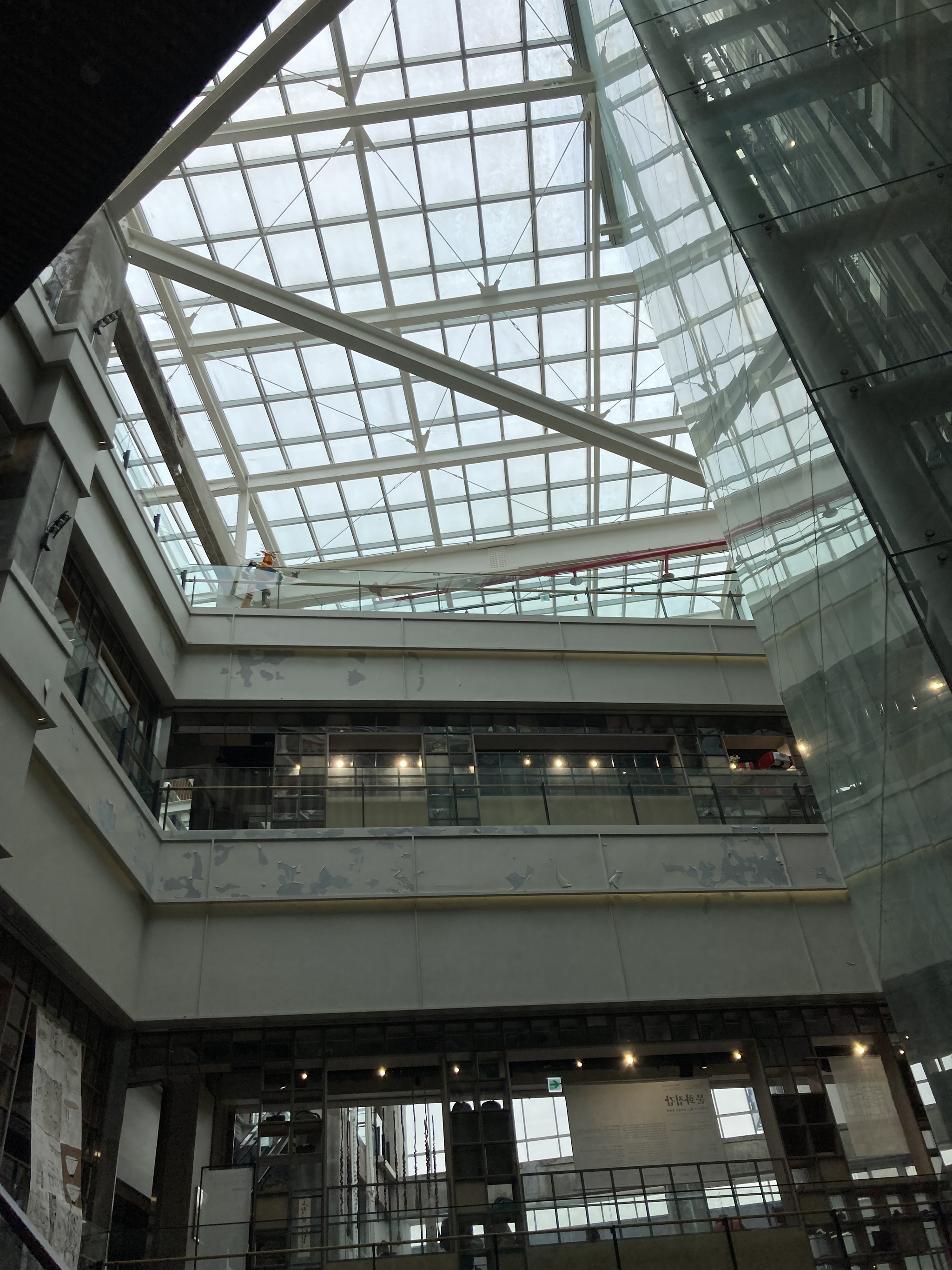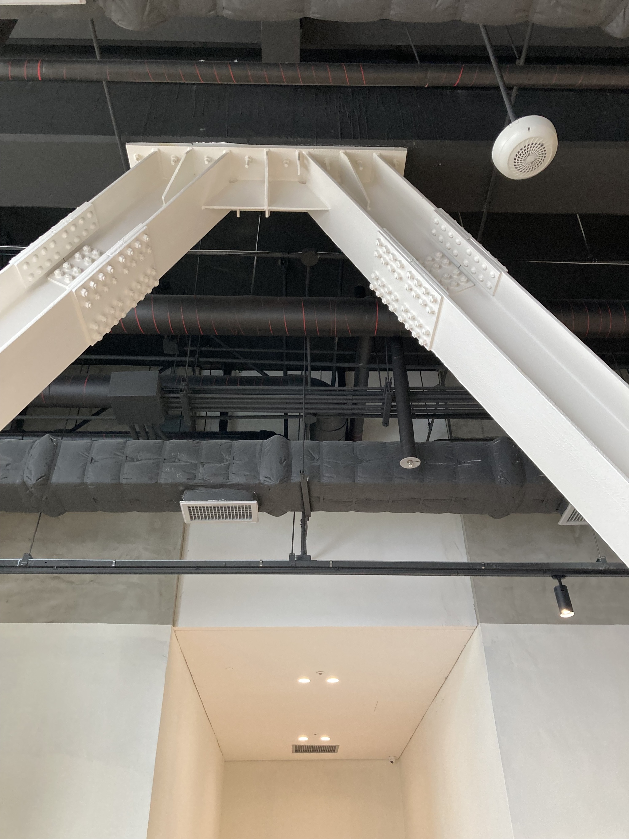 Ниже ядро жесткости- лифтовая шахта из стальных труб, огражденная стеклом. Стекло можно было не ставить))
