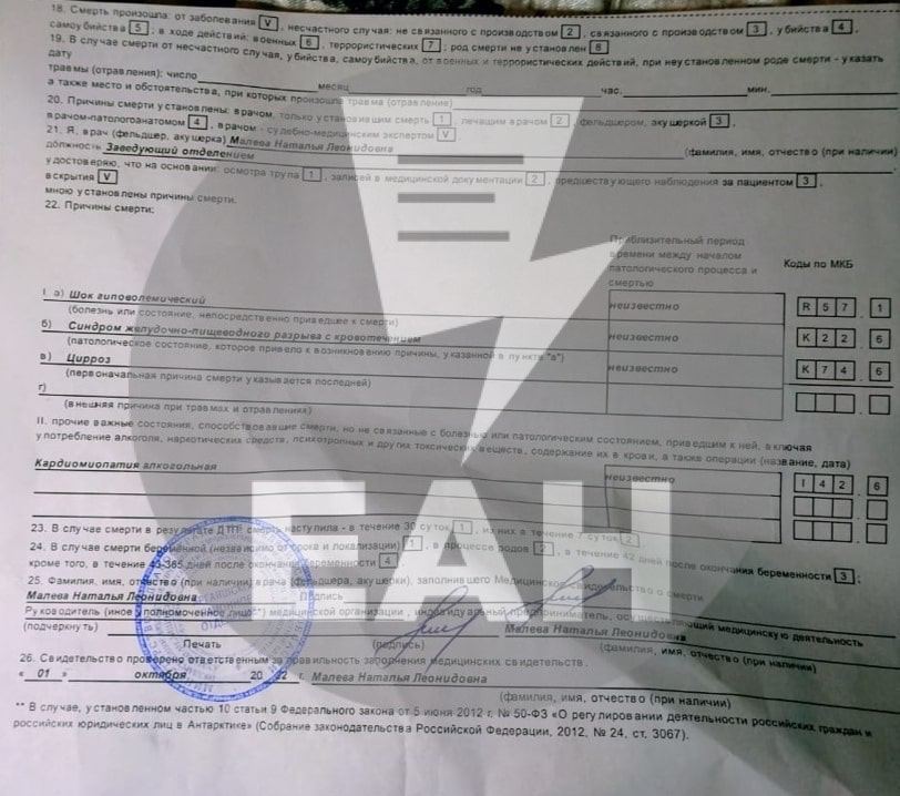 В медицинском свидетельстве о смерти, которое предоставил ЕАН брат умершего Андрей Козлов, сказано, что причиной смерти стал цирроз на фоне алкогольной кардиомиопатиии. Желудочное кровотечение, начавшееся у Дениса перед смертью, было вызвано терминальной стадией заболевания, когда сосуды не выдерживают нагрузки. Андрей не знал о циррозе у брата, тот никогда не жаловался, правда кожу имел зеленоватого оттенка. Раньше выпивал, но в последнее время уже давно не пил.