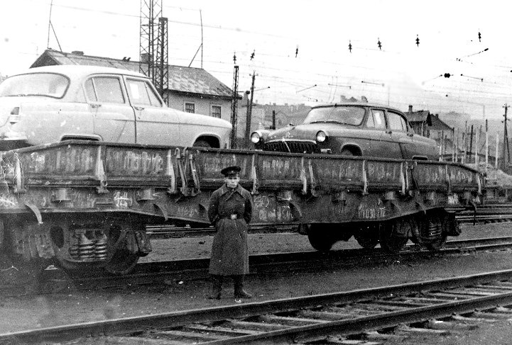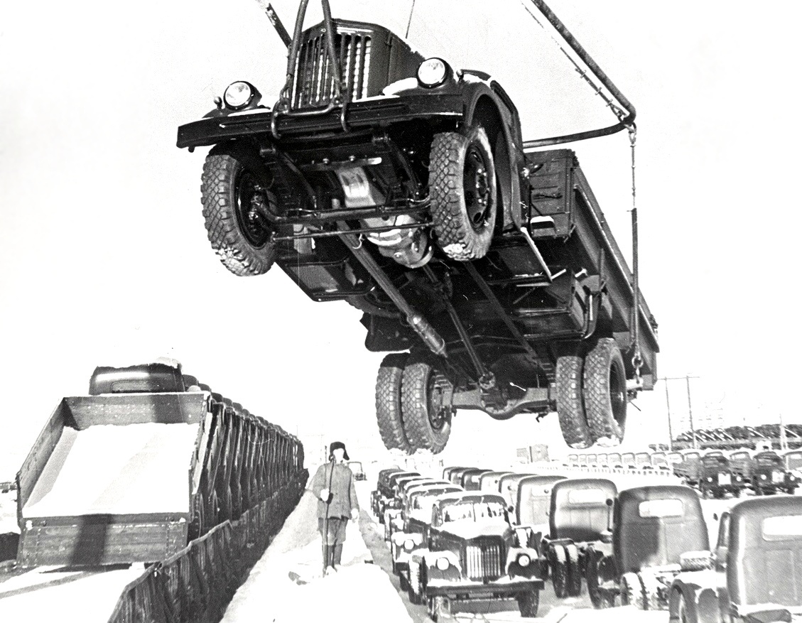 Погрузка в полувагоны автомобилей УралЗИС-355М, Уральский автозавод, город Миасс, Челябинская область, 1960 год: