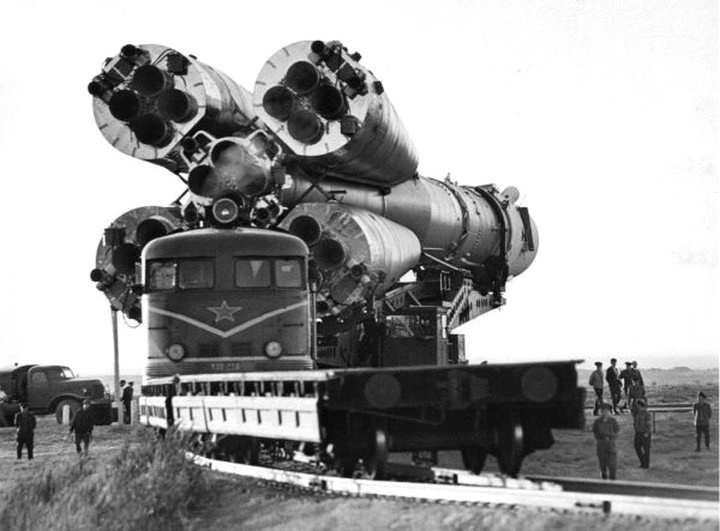 Космодром Байконур, доставка ракеты-носителя с космическим кораблем ''Союз'' на стартовую площадку: