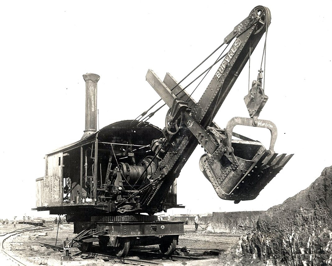 Американский паровой экскаватор "BUCYRUS" на железнодорожном ходу, на строительстве Челябинского тракторного завода, фото 1930: