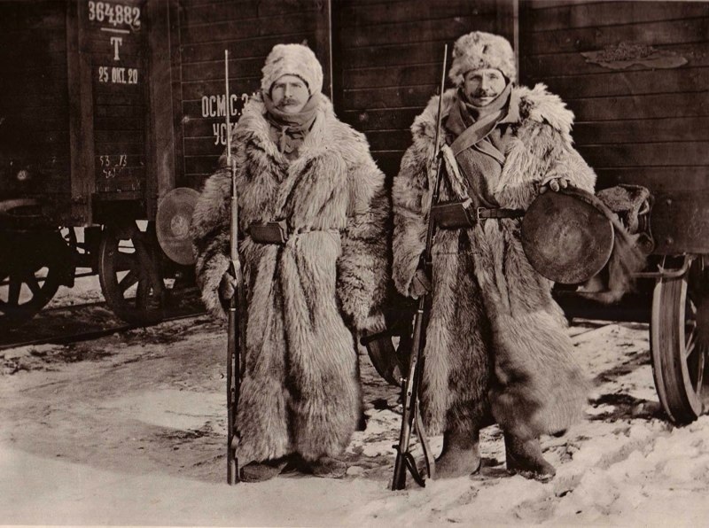 Восстание Чехословацкого корпуса во время Гражданской воны в России; два чешских легионера у железнодорожного состава под Иркутском в январе 1919 года: