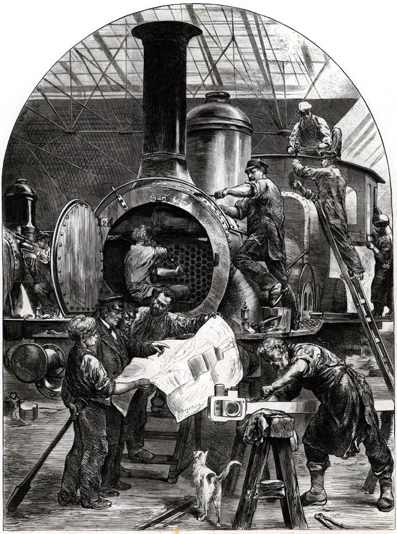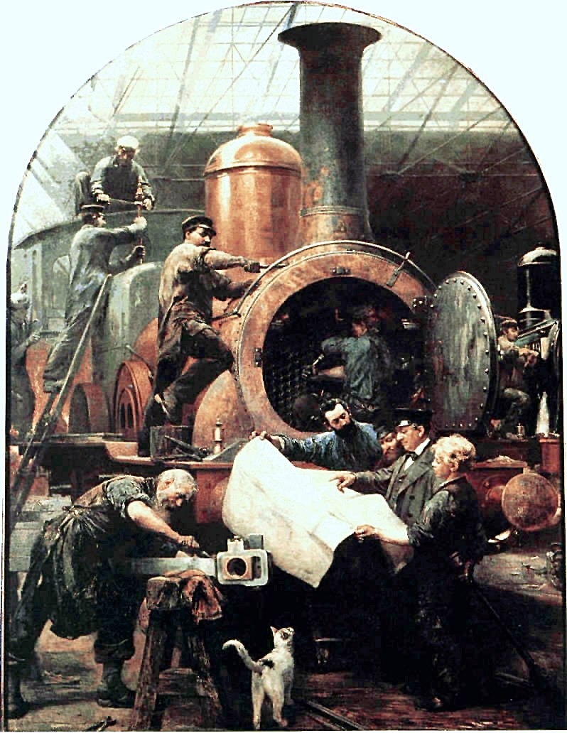 Ну и для тех, кто любит любопытное чтиво: Гравюра, созданная по картине «Завершение работы над локомотивом», изображает окончание работы над первым паровозом Эфельской железной дороги. Оригинал картины художника-графика Пола Фридриха Мейерхейма находится в немецком музее транспорта и технологии. Её создание относится к серии полотен под общим названием «История локомотива», написанной П.Мейерхеймом по заказу фабриканта Альберта Борсига - владельца производства локомотивов "Borsigwerke". Художник создал 7 картин, размером 257 x 272 см иллюстрирующих метаморфозу средств производства в конечный продукт. Седьмая картина из серии была утеряна:
