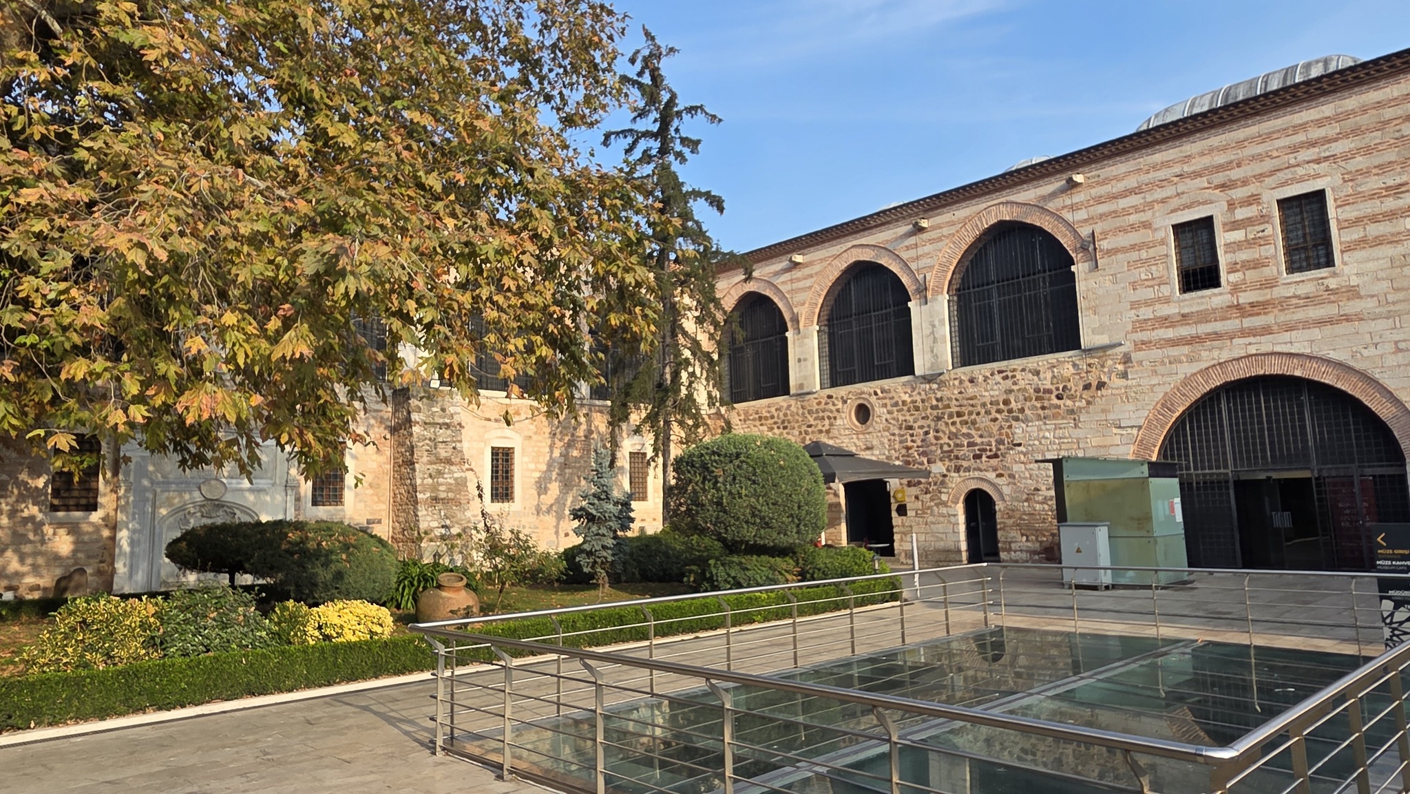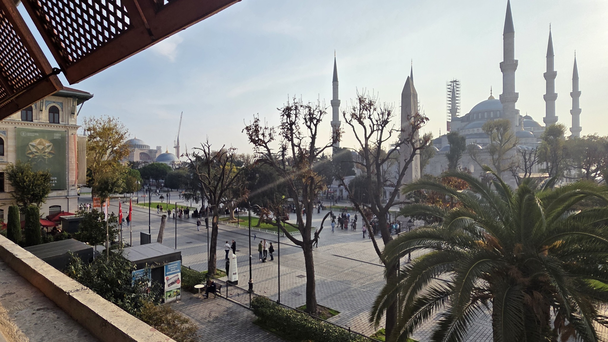 Во-первых, музей находится площади Султанахмет аккурат рядом с музеем Айя Софии. И на втором этаже там имеется... терраса с кафешкой и видом на площадь.