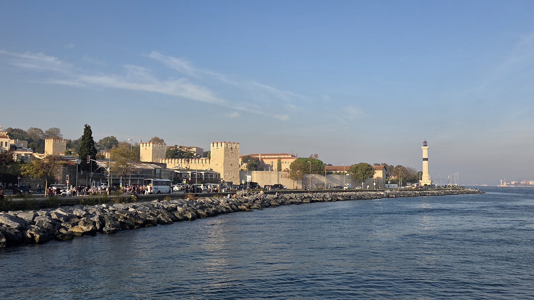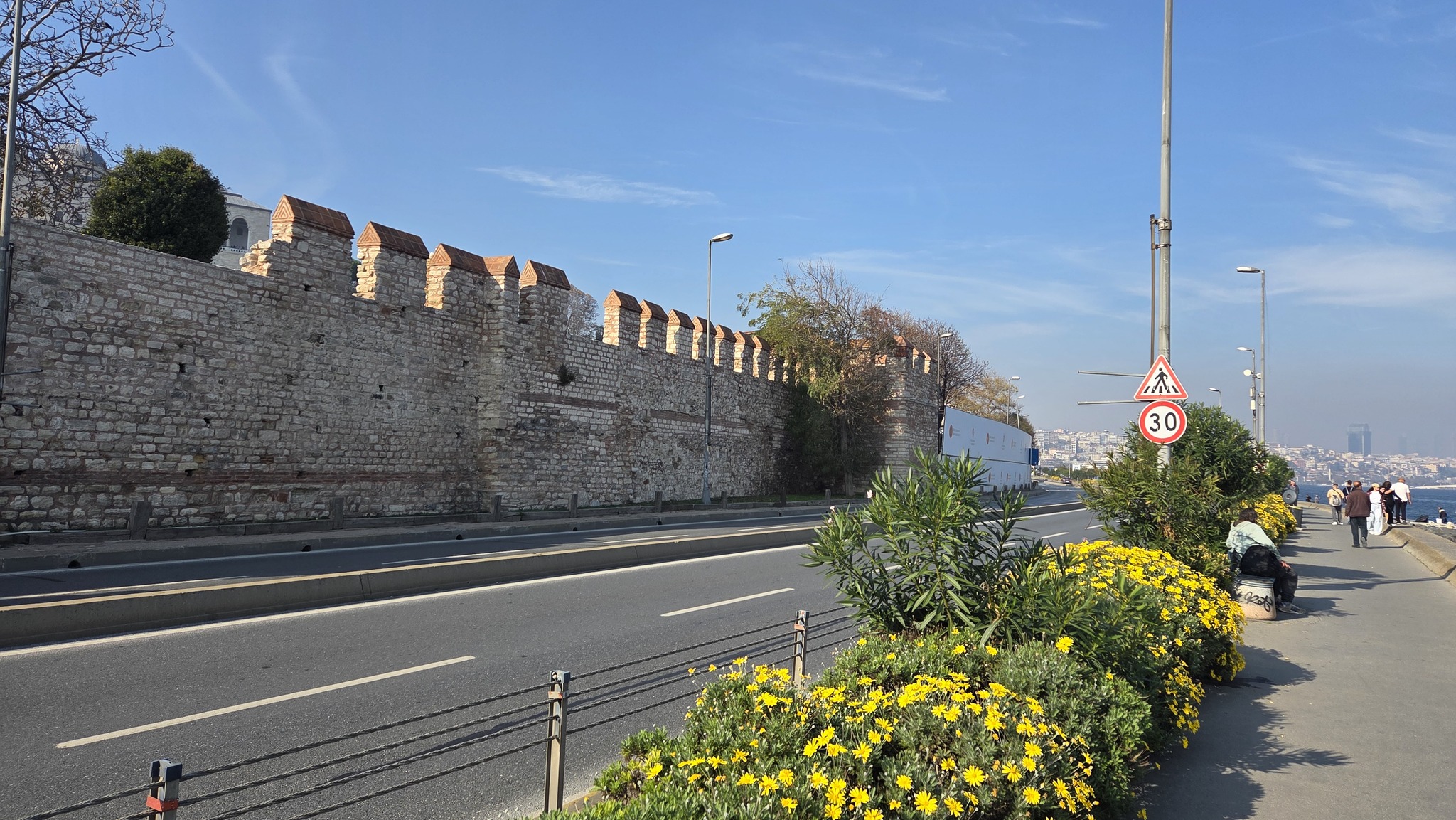 Ладно, зато можно спуститься вниз к Босфору и пройтись по набережной. Оттуда открываются виды на залив, а также на стены и на дворец. (разумеется, в кадр попадут леса - но это не страшно) Только не вздумайте гулять по этой набережной в жаркую погоду - будет пекло! Деревьев там считайте что нет.