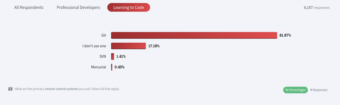 Если переключиться на ответы начинающих разработчиков (скрин ниже), то SVN с 6% падает до 1.5%. Значит, через 3-5 лет в индустрию придут новые разработчики, которые не знакомы с SVN. Кстати, если вы не пользуетесь СКВ, то вы либо в 1.38% профессиональных разработчиков, либо среди 17% новичков. Учите git, любите git.
