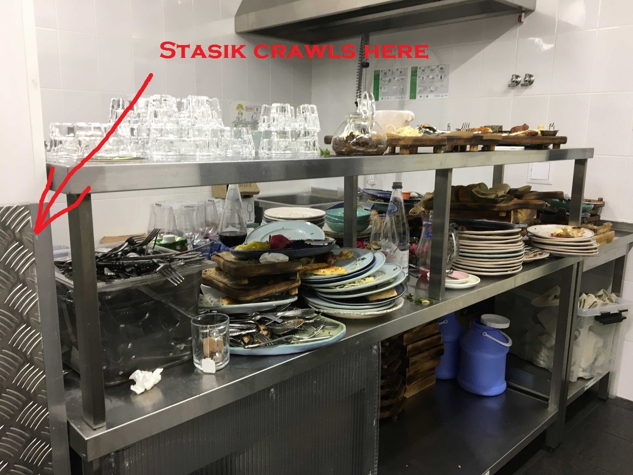 У Стасика есть друг - Фёдор(Федя) и они очень любят ползать вместе во все места нашего заведения! Мы наблюдаем за ними уже много месяцев. Эта фотосессия сделана возле мойки, однако, ничто не мешает Стасику проползти пару метров до кухни, потому что там лежат всякие вкусности, которые он так любит, и даже заползти в чей-нибудь салат, но это не точно...