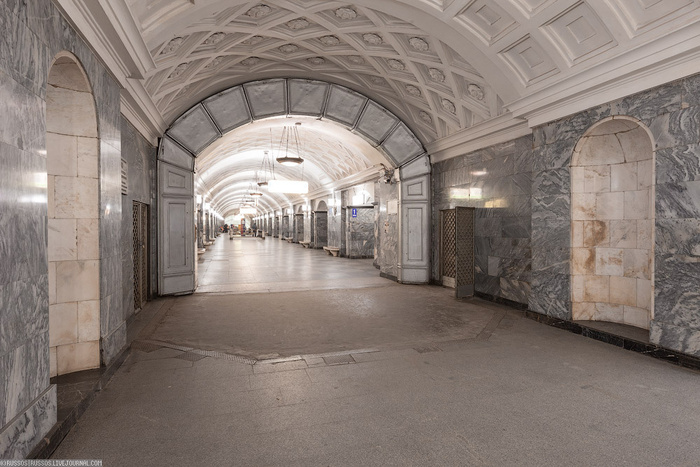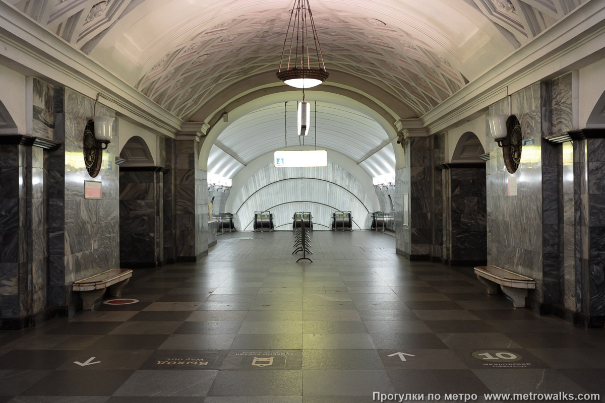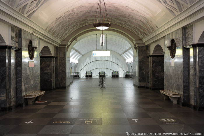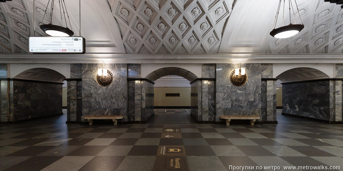 Пол в центральном зале станции сделали из мрамора серого и белого цветов. Они чередовались в шахматном порядке. По бокам композицию украсили меандром. Это такой геометрический орнамент из ломаной под прямым углом линии или спиральных завитков. Также в центральном зале установили мраморные скамейки. Эта идея коллегам Полякова не очень понравилась. В специальной литературе того времени писали, что лучше бы места для сидения поставили только на боковых платформах. Тут же они мешали движению пассажиров и смотрелись не очень уместно.