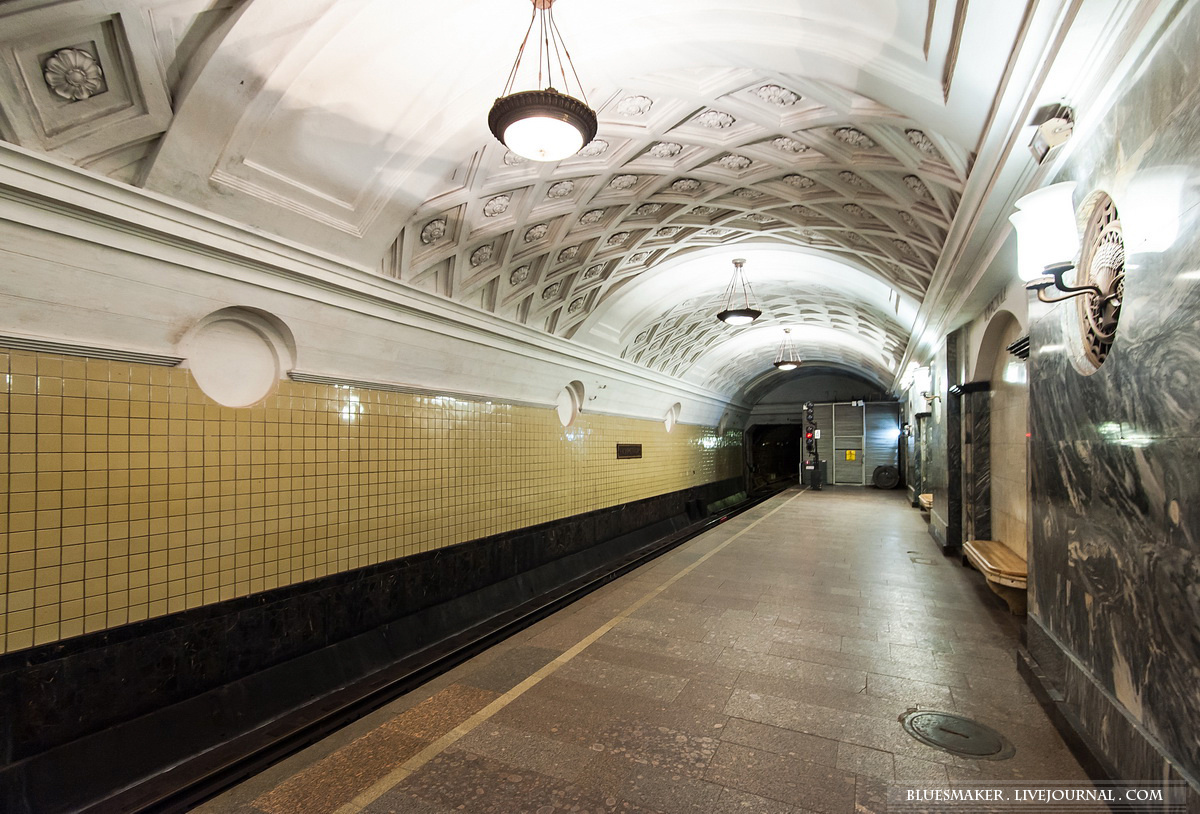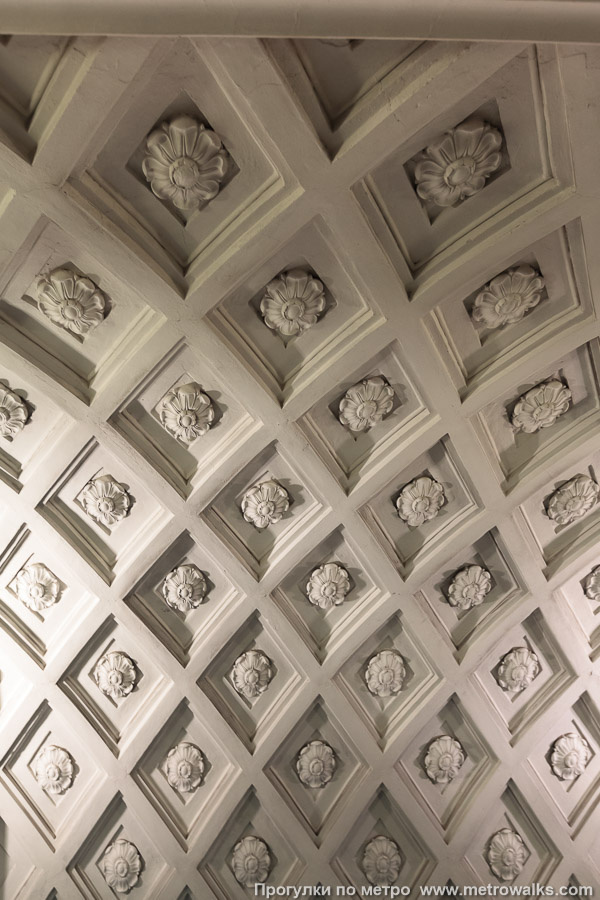 Отдельного внимания заслуживало оформление сводов станции. Здесь довольно сложные рельефные украшения. Основные из них - это кессоны (углубления) в форме ромбов. Внутри каждого разместили цветок. Чтобы у пассажиров не рябило в глазах от большого количества лепного декора, его разбавили гладкими арочными полосками. Они как бы соединяли между собой выступы на пилонах. Для освещения, помимо упомянутых ранее бра, использовали огромные люстры в виде чаш из молочного (матового) стекла в бронзовой оправе. Кроме того, в торцах платформы установили по два торшера. У эскалаторов для них сделали ниши в форме арок. К сожалению, со временем эти светильники были утрачены. Однако ниши сохранились до наших дней.