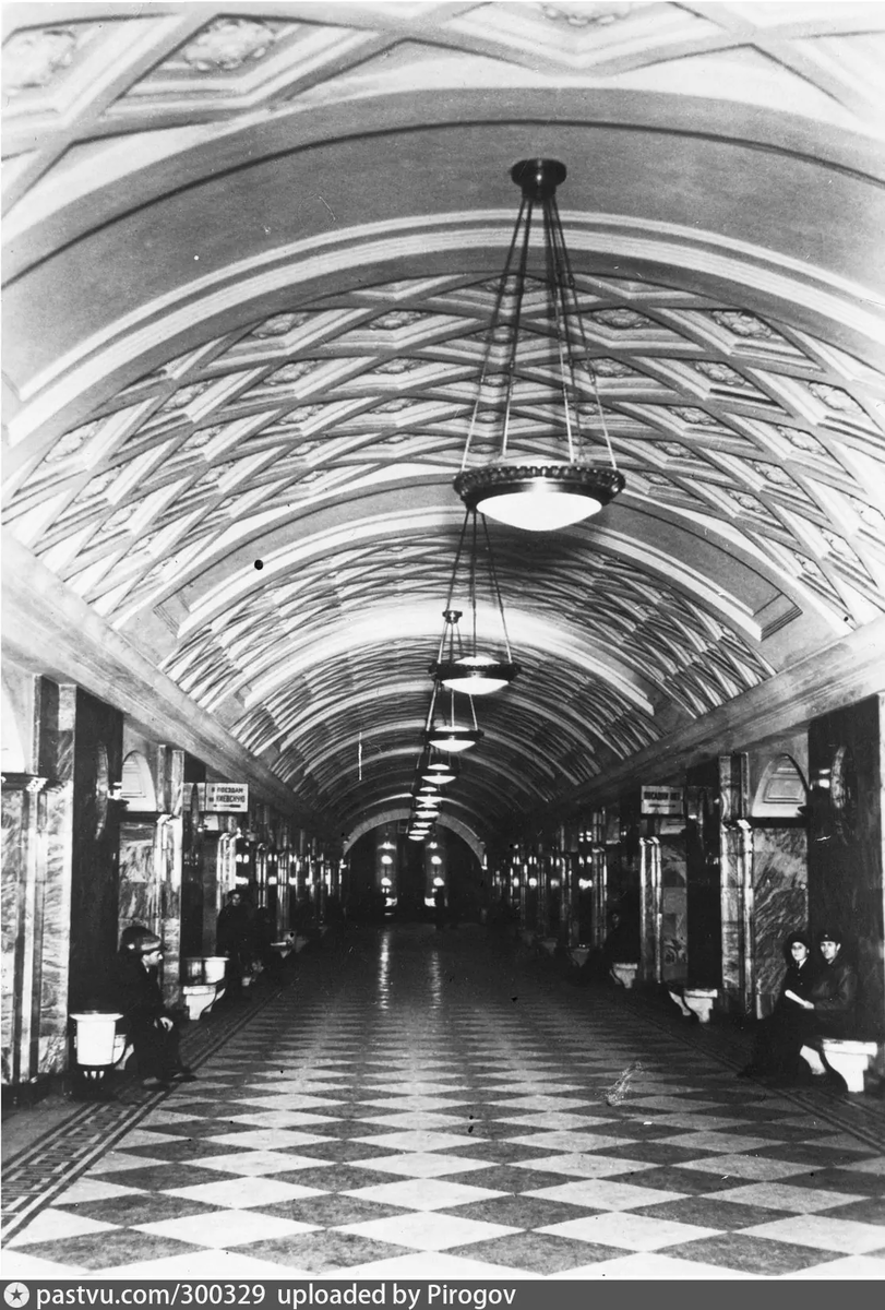 Оформление пола центрального зала станции "Курская". По середине мраморные квадраты в шахматном порядке. По краям тот самый меандр, 1938. Автор фото: Н.С. Грановский. С сайта www.pastvu.com.