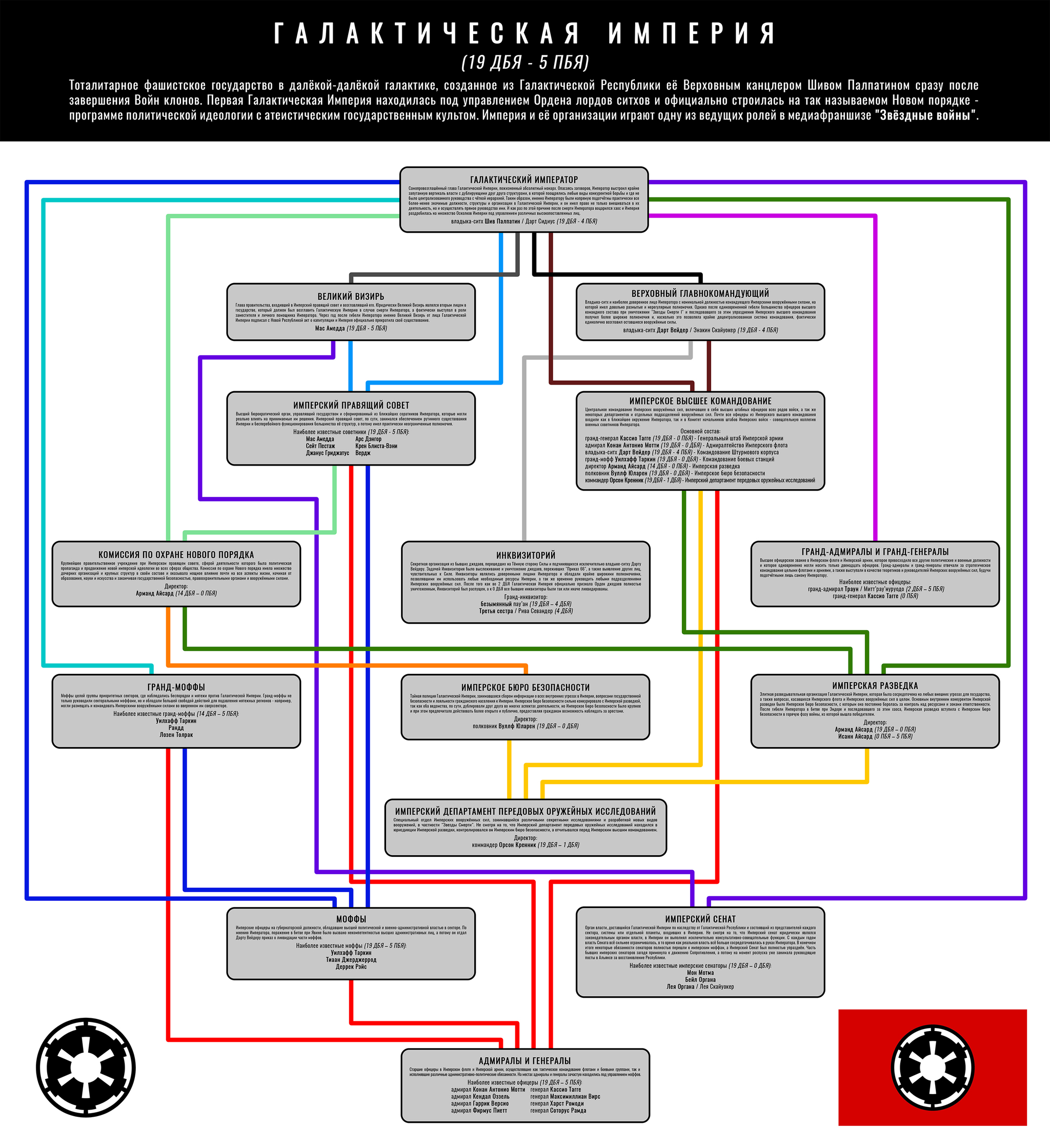 Поэтому в этом посте используется максимально понятная и слегка упрощённая схема, но следует держать в уме, что отдельные части и подразделения почти всех государственных структур могли пребывать во временном оперативном подчинении у других структур. Всё зависело от целей и задач, которые ставил Император, а так же от его личного пожелания. Захотел Император - и Дарт Вейдер перешёл под командование генерала, захотел Дарт Вейдер - и взял под командование целый кусок имперского флота вместе с его адмиралом. Такие пироги, в Империи Палпатина было возможно многое, а сам он очень любил смотреть на грызню людишек между собой за власть, а наиболее амбициозных и зубастых всегда поощрял. При этом абсолютная власть была только у него самого и он крайне бдительно следил за тем, чтобы это правило оставалось нерушимым.