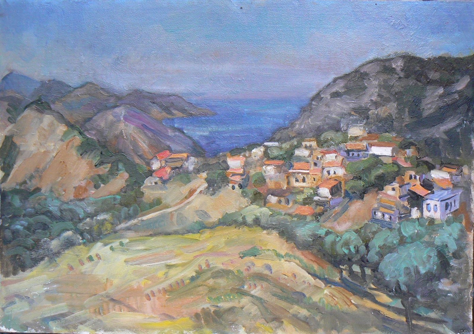 hudoznik Старая деревня на Крите. 2013, картон, масло 11 лет назад Как-то решил прогуляться от побережья в горы. Набрел на заброшенную деревню Ахлада. Все ее жители переселислись ближе к берегу и занялись турбизнесом. [моё] Живопись Картина Пейзаж Крит