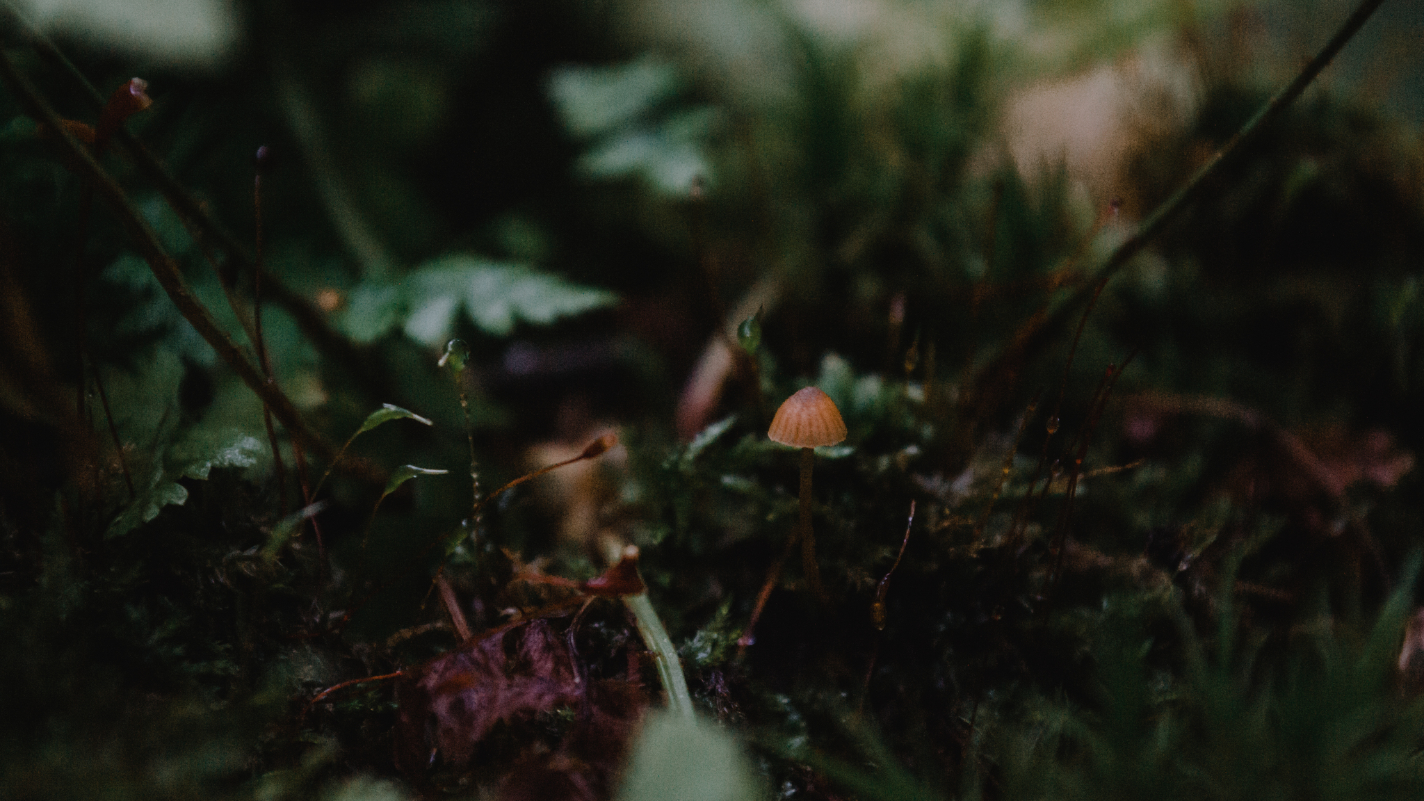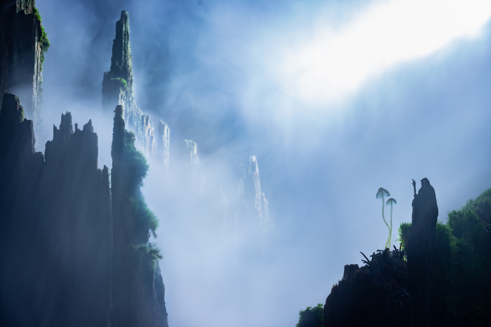 Основная сложность (отнесу её к технической) была в том, чтобы найти подходящую натуру. Я примерно представлял, что и как должно быть в итоге, но для начала надо было всё это добро найти. Потом я установил камеру на штатив, дождался в лесу густых сумерек, если не сказать темноты, закрепил фонарик (светодиодный), чтобы осветить сцену и чтобы он был основным источником света, затем пролил весь пень горячей водой. Вообще, я пробовал разные способы спародировать туман, но в этом случае была именно горячая вода + естественный туман, которых появился с темнотой. А дальше пробы кадра: Canon 77D, Индустар 61ЛЗ и выдержка что-то около 1,5с.