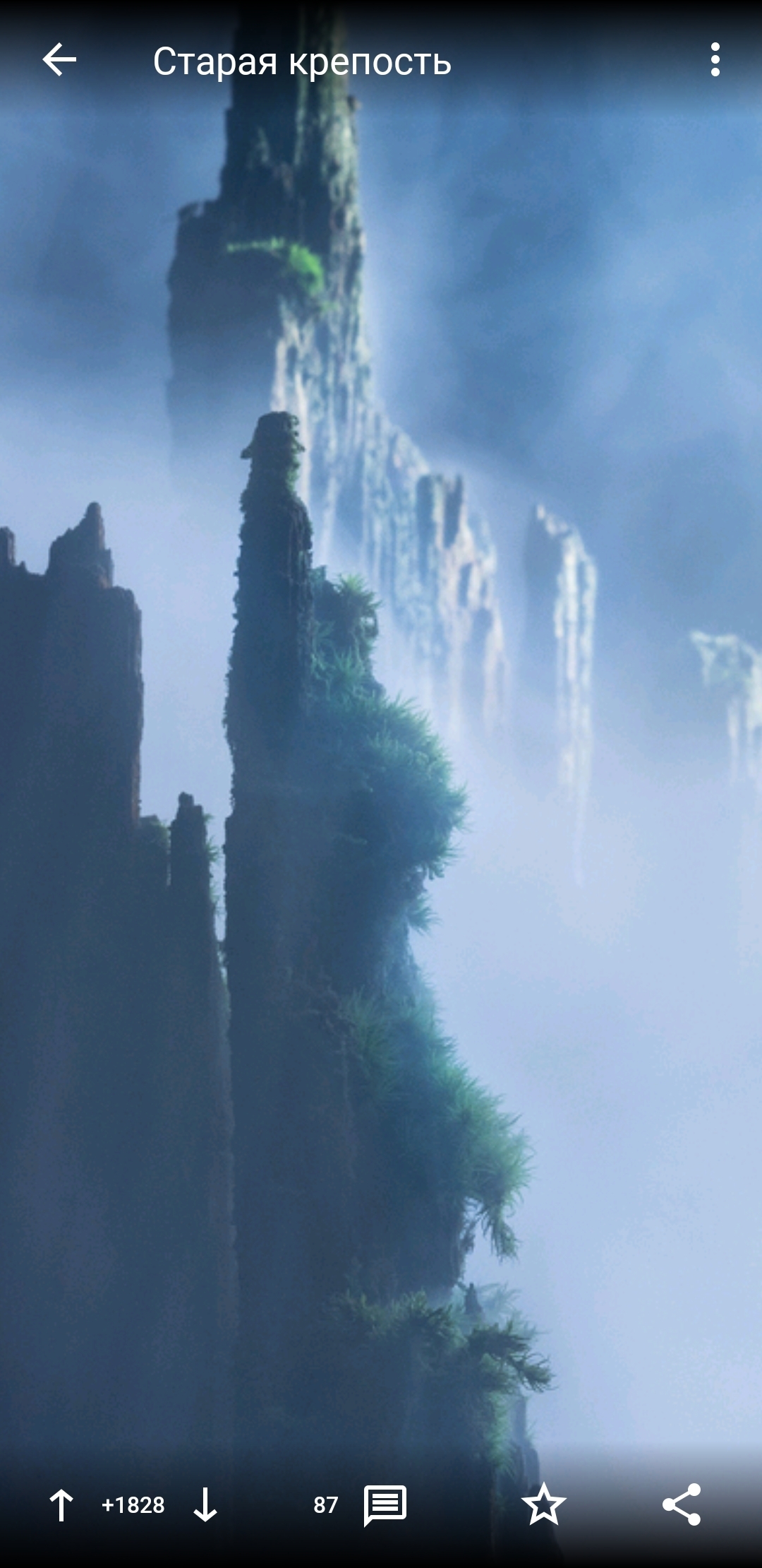 «Интересный арт. Горы, старая замшелая скульптура. А вот огромные грибы тут не к месту, конечно. Где крепость? Или скульптура - это всё, что осталось? Грибы, зачем тут грибы? Это арт к игре? Пойду посмотрю, что там под темой»