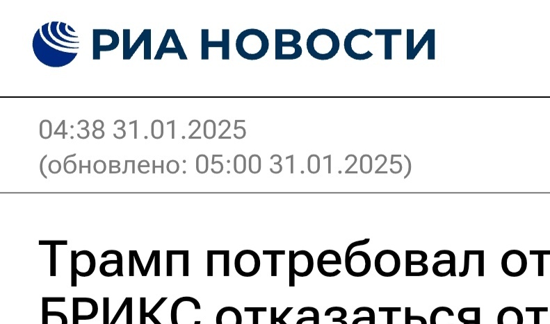 61 PavelGerman Новости Кратко Старая новость про Америку и валюту БРИКС Серия Из мира СМИ 11 месяцев назад Трамп призвал отказаться от валюты БРИКС и пригрозил 100% пошлинами, а так же запрет продаж на (цитата) "великолепном американском рынке" 😂🤔источник: РИА Новости Коротко Мир Россия США БРИКС Политика Новости РИА Новости Текст 5 1 1 Ещё 0