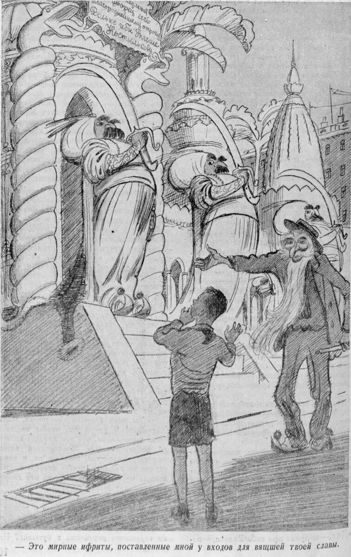 — Чего ты кричал? Чего ты развел эту дикую панику? — сердито спросил уже на улице Волька у Хоттабыча.