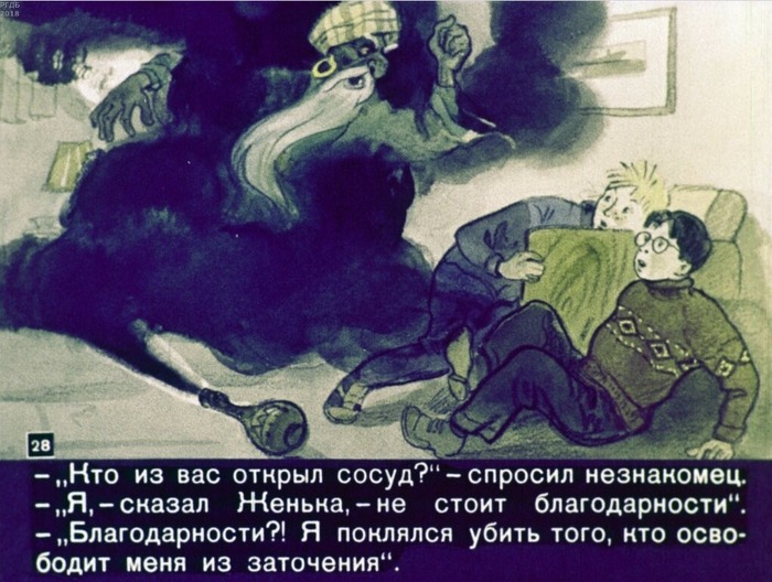 «В книге «Тысяча и одна ночь» есть «Сказка о рыбаке». Вытянул рыбак из моря свои сети, а в них – медный сосуд, а в сосуде – могучий чародей, джинн. Он был заточен в нем без малого две тысячи лет. Этот джинн поклялся осчастливить того, кто выпустит его на волю…».