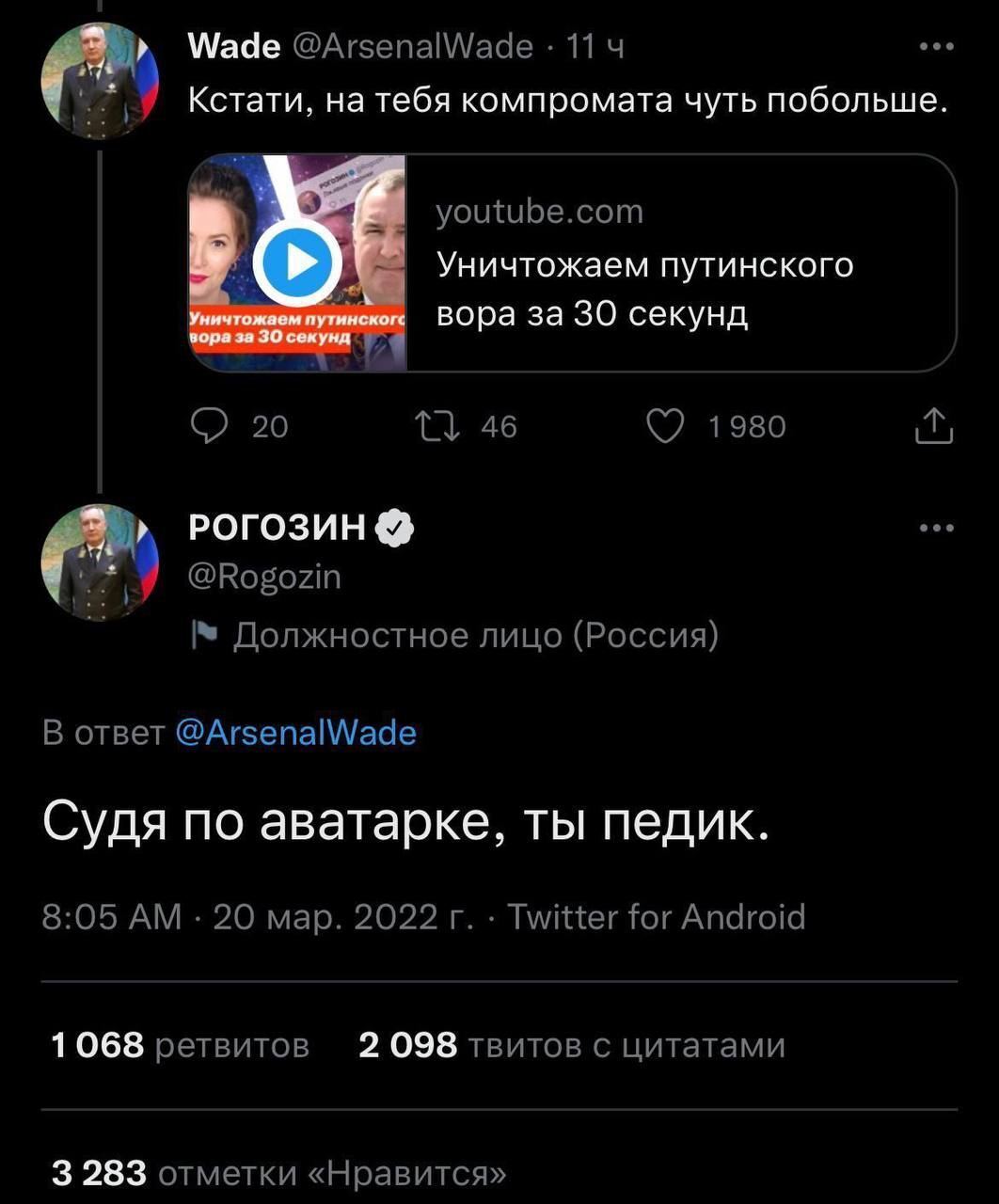 297 HYKAKTAKTO Старое про барогозина 5 месяцев назад Вспомним самострел в твиттере в 2022. Рогозин оскорбил аватарку пользователя, но пользователь взял и поменял её на фото Рогозина. После этого Рогозин сменил своё фото профиля. X (Twitter) Дмитрий Рогозин Аватарка Юмор 32 5 Ещё 0