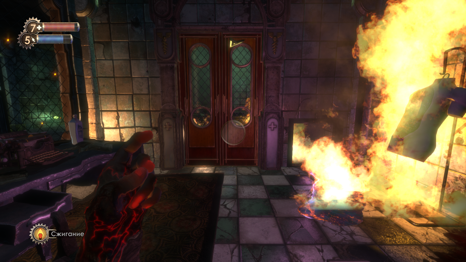 Одной из самых заметных и определяющих фишек BioShock стали плазмиды. Причём важно понимать: это не просто «магия вместо оружия», а полноценные инструменты взаимодействия с миром. Да, удар током может оглушить врага, чтобы добить его гаечным ключом или выстрелом в упор. Да, противники в воде становятся особенно уязвимыми — игра последовательно следует собственной логике, и токопроводящая среда действительно проводит ток. Но тем же электричеством можно отключать турели, камеры наблюдения, враждебные машины или взламывать электрические замки. Другие плазмиды по своему отличны огонь по щелчку пальцев превращает цель в живой факел, заморозка превращает противника в хрупкую статую, что можно разбить на осколки (вместе с лутом, прости-инвентарь), телекинез позволяет отправить гранаты и ракеты обратно, для садистов есть рой пчёл, что отвлекает и жалит мутантов, ловушки отправляют врагов в потолок, будто сам город пытается их проглотить, а гипноз Большого Папочки на секунду делает из живого тарана твоего личного телохранителя. Плазмиды здесь — это не только способ убивать, но и способ решать задачи.