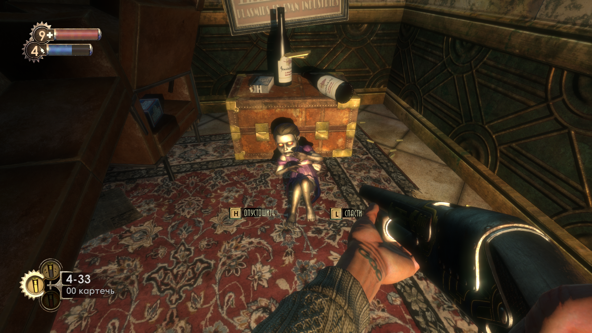 При этом BioShock никогда не заставляет игрока полагаться только на плазмиды. Почти у каждой способности есть альтернатива. Нужно поджечь врага — есть зажигательные патроны. Нужен ток — электрическая картечь. Есть распылитель с несколькими типами боеприпасов (огонь, лёд, электричество), арбалет с разными болтами, классический арсенал эпохи: револьвер, автомат, дробовик, гранатомёт. Оружие и плазмиды здесь не конкурируют, а дополняют друг друга, позволяя выстраивать стиль игры под себя да и любой ствол можно прокачать на специальных станциях: повысить скорострельность, увеличить магазин или улучшить точность