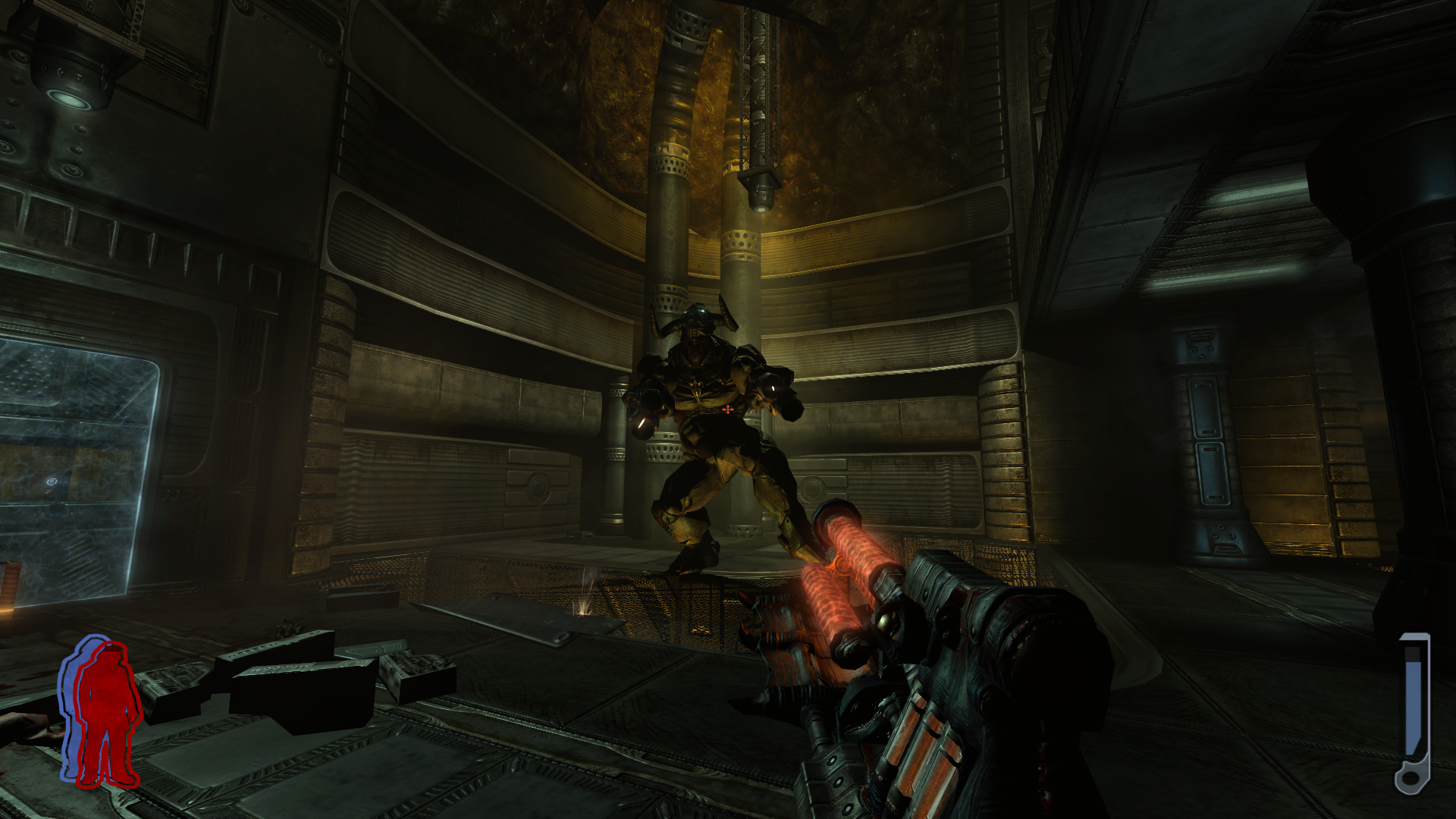 Ну и транспорт — в виде летающих платформ — позволяет исследовать огромные участки корабля. Иногда хочется просто остановиться и осмотреться. Это впечатляющие по масштабу пространства, особенно если вспомнить, что игра работает на движке id Tech 4 — том самом, где Doom 3 не мог себе позволить и половины такого размаха.