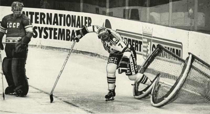Матч СССР – Финляндия. 1986 г. Вратарь сборной СССР Владимир Мышкин.