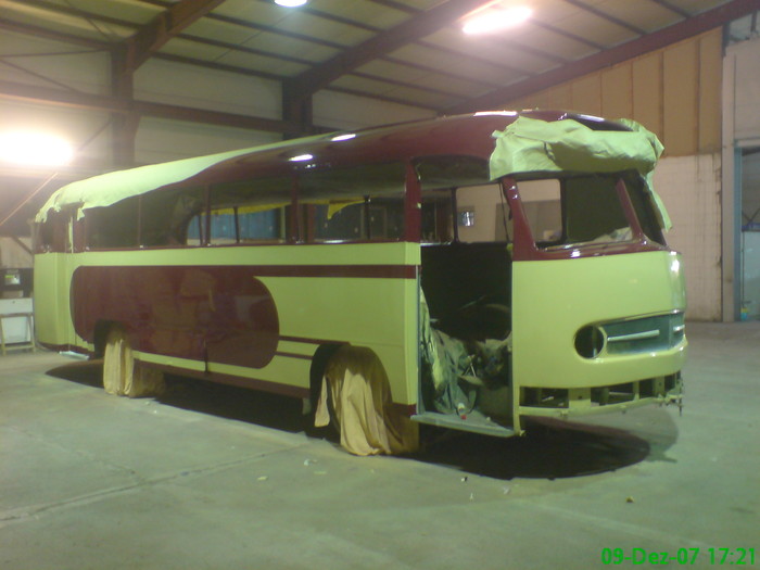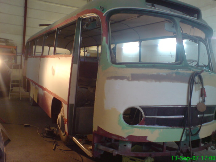 Расскажу про мой опыт восстановления старых автобусов, это второй в моей практике.Винтажный автобус Mercedes-Benz O 321 H 1957 года. Хозяин автобусной фирмы имел в своем распоряжении 21 современный автобус, и каким то боком затесался этот дедушка. На нем был только кузов, мотор и ходовая.Все стекла,двери,пол,сиден,я и стены были сняты. Частично все утеряно, а алюминиевые детали которые наиболее использовались-окислилис и сгнили.Но облицовочняе накладки были целы.Как на этом ,так и на следующих работах с этим клиентом, я принимал участие в выборе цветовой гаммы как внутри так и снаружи.Делал его два года один, лишь при обтяжке салона, руля и установке стекла привлек своего отца.Еще на пару недель вызывал одного интересного пожилого еврея из Молдавии, он помогал листы металла по бокам укреплять, одному тяжело было.При сборке произошла неприятность, был уже последний штрих при установке лобового стекла, и мне показалось , что с водительской стороны стекло не плотно прижато.Я слегка стукнул и оно треснуло. Стекол этих на тот момент в продаже в Европе небыло, Тео купил в Польше за 2000 Евро последние.Мерседес по непонятным мне причинам не смог изготовить. Выход из положения предложил Андрей из России, в Москве ,на одной из фирм изготовили два стекла,600 Евро, но они смогли высоту уже на 10 см сделать.Выбора не было, я позвал опять отца и мы переделали рамку ветрового стекла, на первой и последних фото видны изменения.После окончания работы ,я получил контракт на работу в этой фирме, но долго не смог.Четыре года я поездил на автобусе по Германии и Евпопе. С его хозяином хорошие отношения, осенью 2020 он приезжал ко мне на новое место жительства.Автобус этот часто вижу на дорогах, его заказывают на свадьбы и торжества всякие.