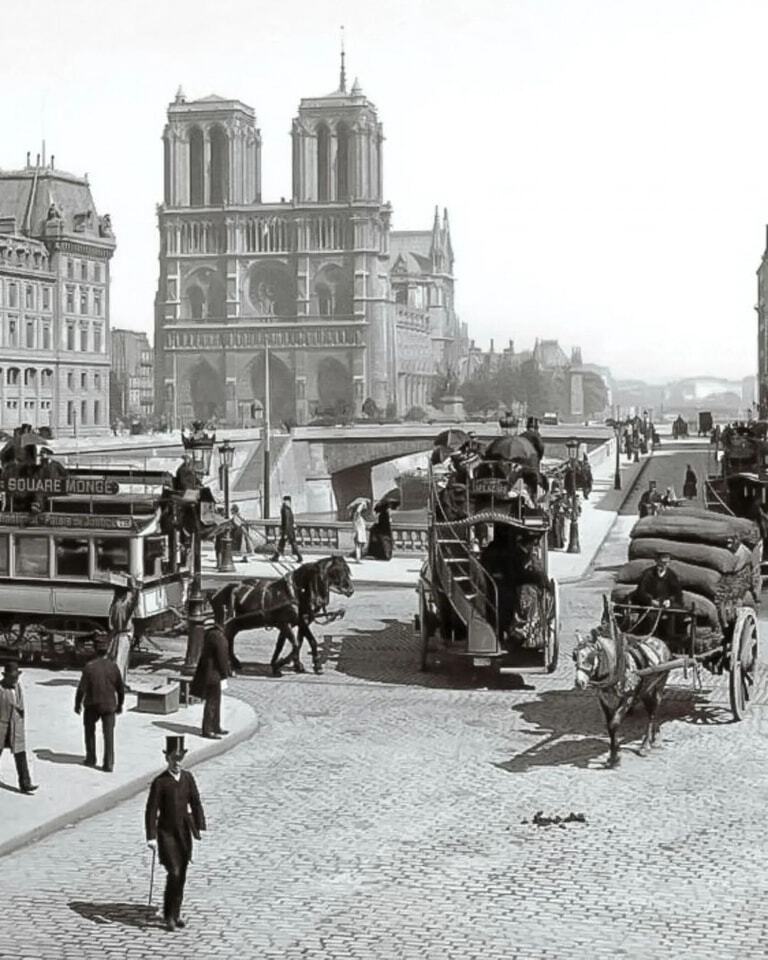 Площадь и мост Сен-Мишель не изменились с 1900 года, в отличие от Собора Парижской Богоматери, который на несколько лет потерял свой шпиль.