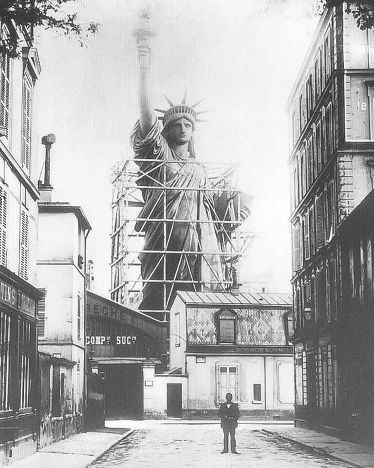 Статуя Свободы, подарок Франции Соединенным Штатам, уже великолепно смотрелась в парижской строительной мастерской в 1884 году, за два года до ее открытия в Нью-Йорке.