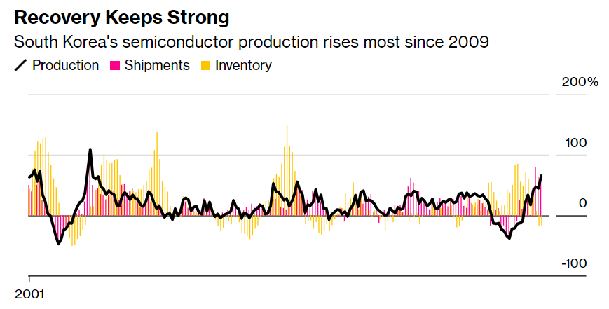 Производство подскочило на 65,3% по сравнению с предыдущим годом, что является самым большим ростом с конца 2009 года, согласно данным, опубликованным в пятницу Национальным статистическим агентством. Поставки полупроводников также выросли на 59%, хотя и были слабее, чем 62,7% в январе. Запасы сократились на 16,2%, снижаясь второй месяц подряд, что является еще одним признаком высокого спроса.