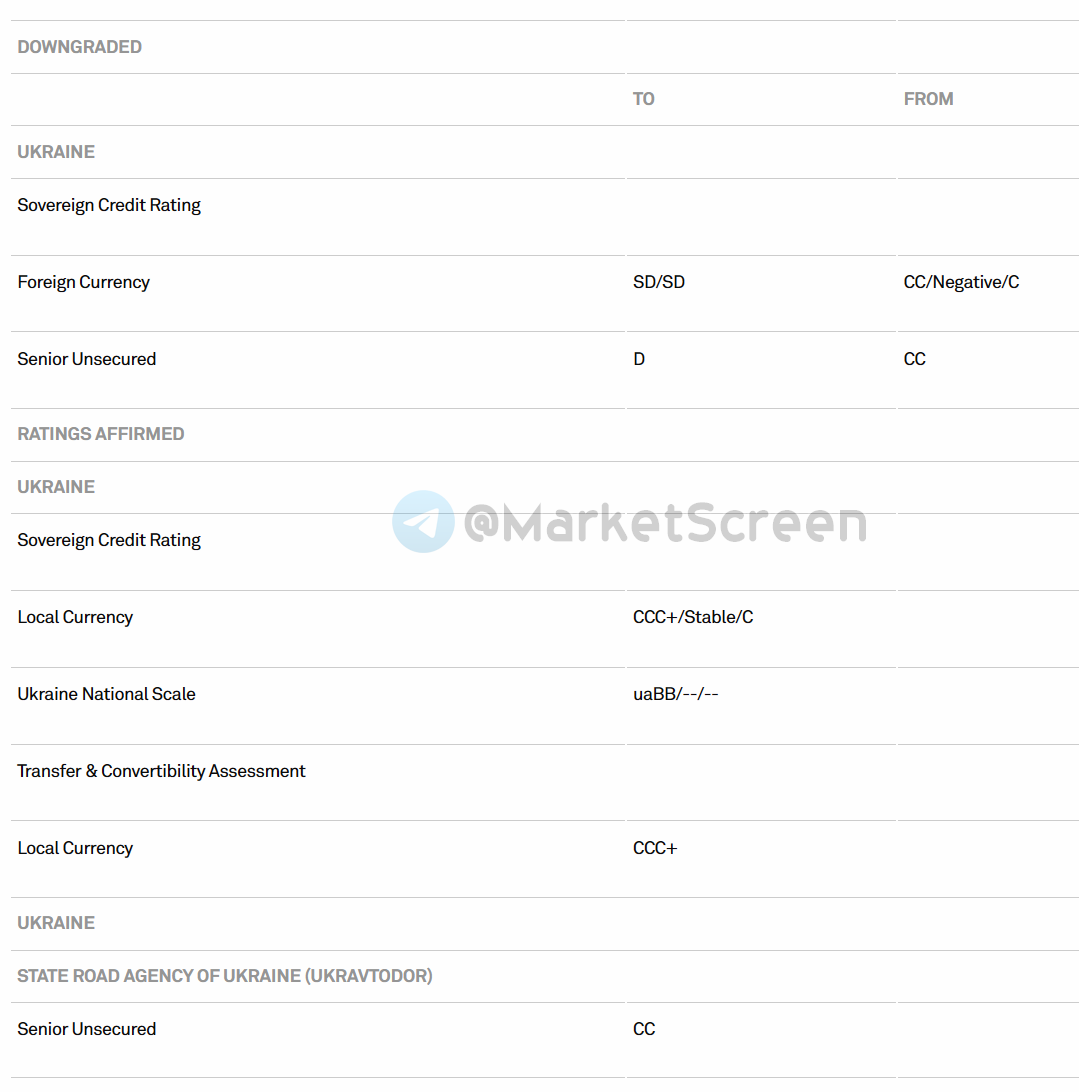 Мы (они - Standard & Poor’s) понизили наши долгосрочные и краткосрочные рейтинги Украины в иностранной валюте (FC) до "SD/SD" (выборочный дефолт) с "CC/C", а рейтинги выпуска суверенных еврооблигаций 2026 года выпуска до "D" (дефолт) с "CC".