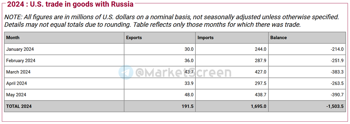 По последним данным, а это май 2024, импорт российских товаров в США составил 438,7 млн.$. Экспорт из США в РФ - 48,0.