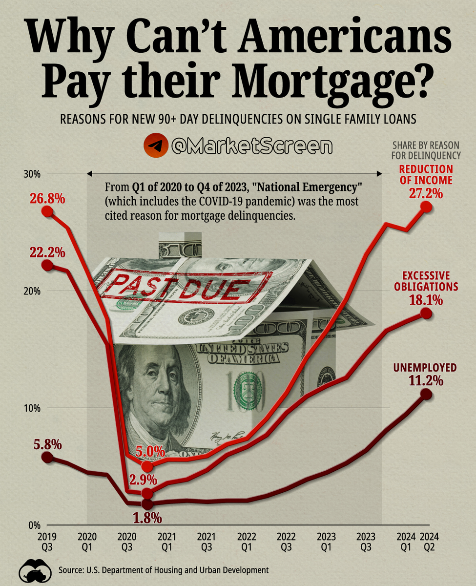 На этом графике показаны финансовые причины, по которым американцы не могут (ну те, которые не могут) выплачивать свои ипотечные кредиты в 2024 году, основанные на данных Министерства жилищного строительства и городского развития США. Финансовые причины, приводящие к новым просрочкам по ипотечным кредитам на 90 дней и более в домах на одну семью.