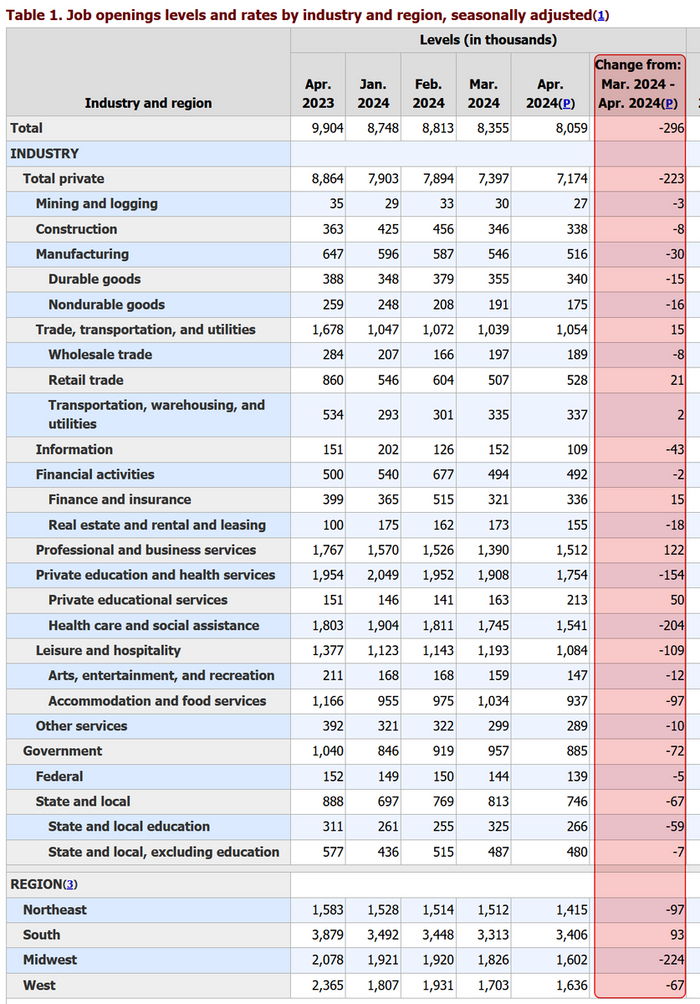 Число открытых вакансий в США сократилось до 8,06 млн в апреле по сравнению с пересмотренными в сторону понижения 8,4 млн в марте, что является самым низким показателем с 2021 года.