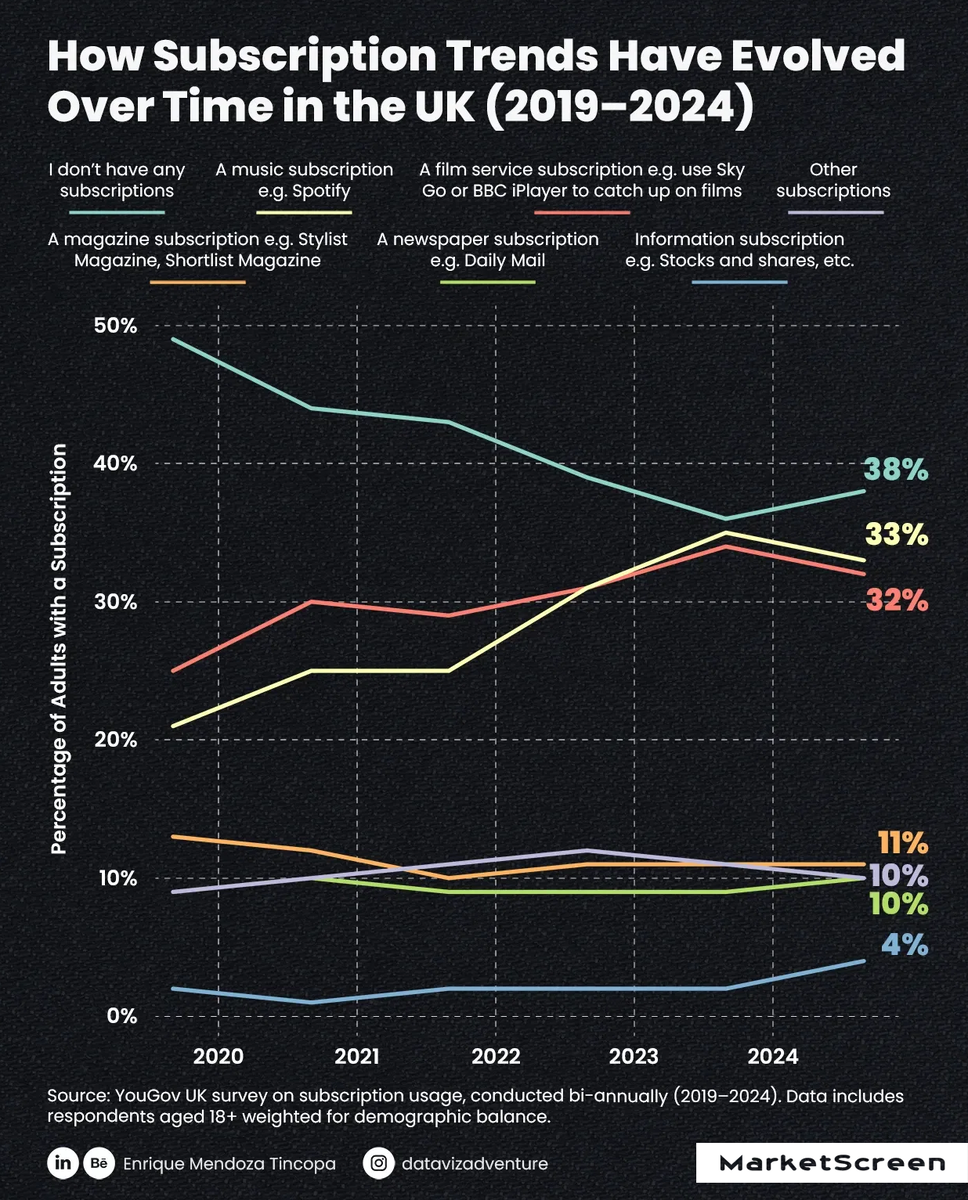 Пятница. Познавательное. Лёгкое. С сентября 2019 года YouGov проводит в Великобритании два раза в год опрос об использовании подписок. Подписки стали важной частью повседневной жизни, поскольку люди все больше ценят удобство, гибкость и постоянный доступ. В опросе британцам задается вопрос, имеют ли они какие-либо из перечисленных типов подписок.