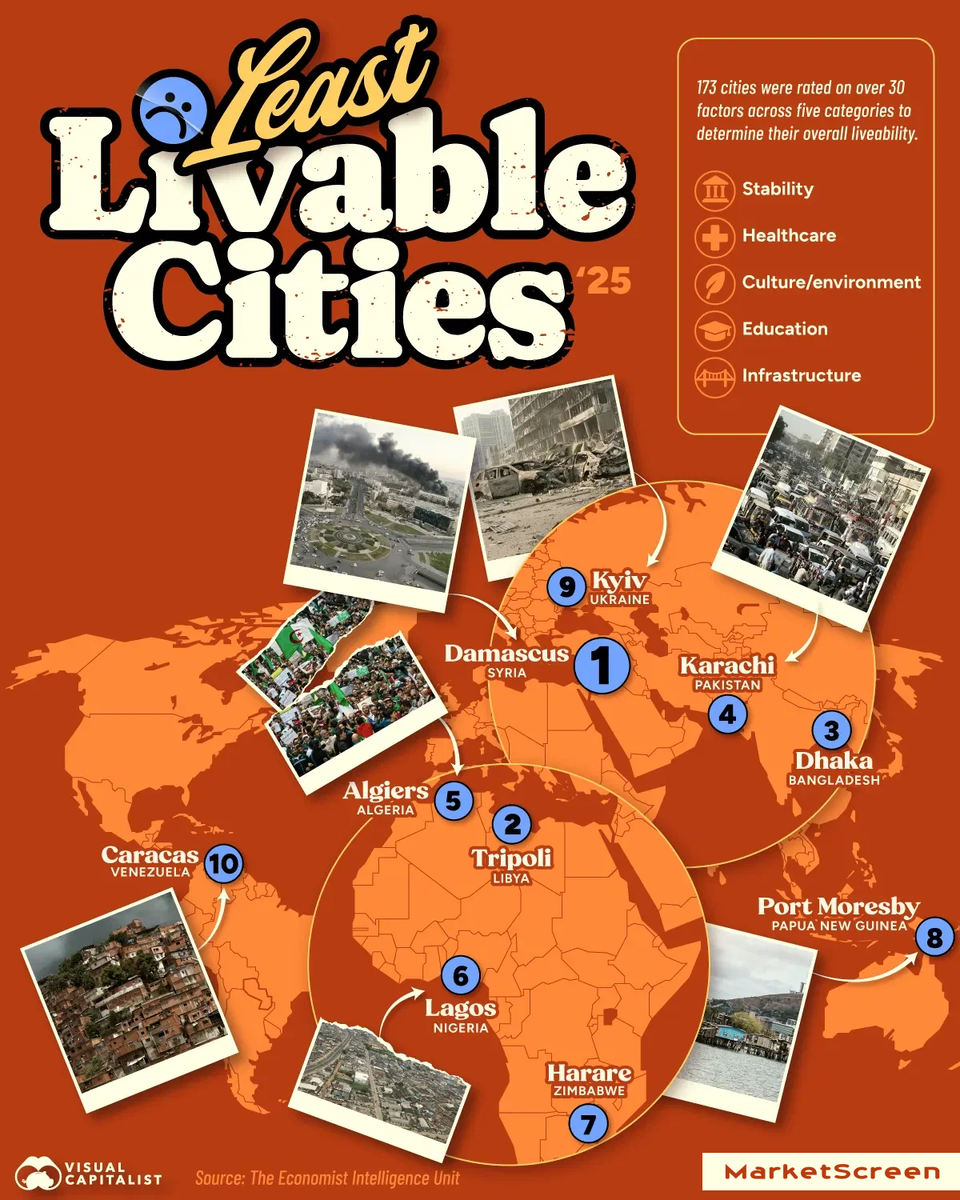 10 наименее пригодных для проживания городов мира, согласно Глобальному индексу привлекательности для проживания 2025 года, составленному журналом The Economist.