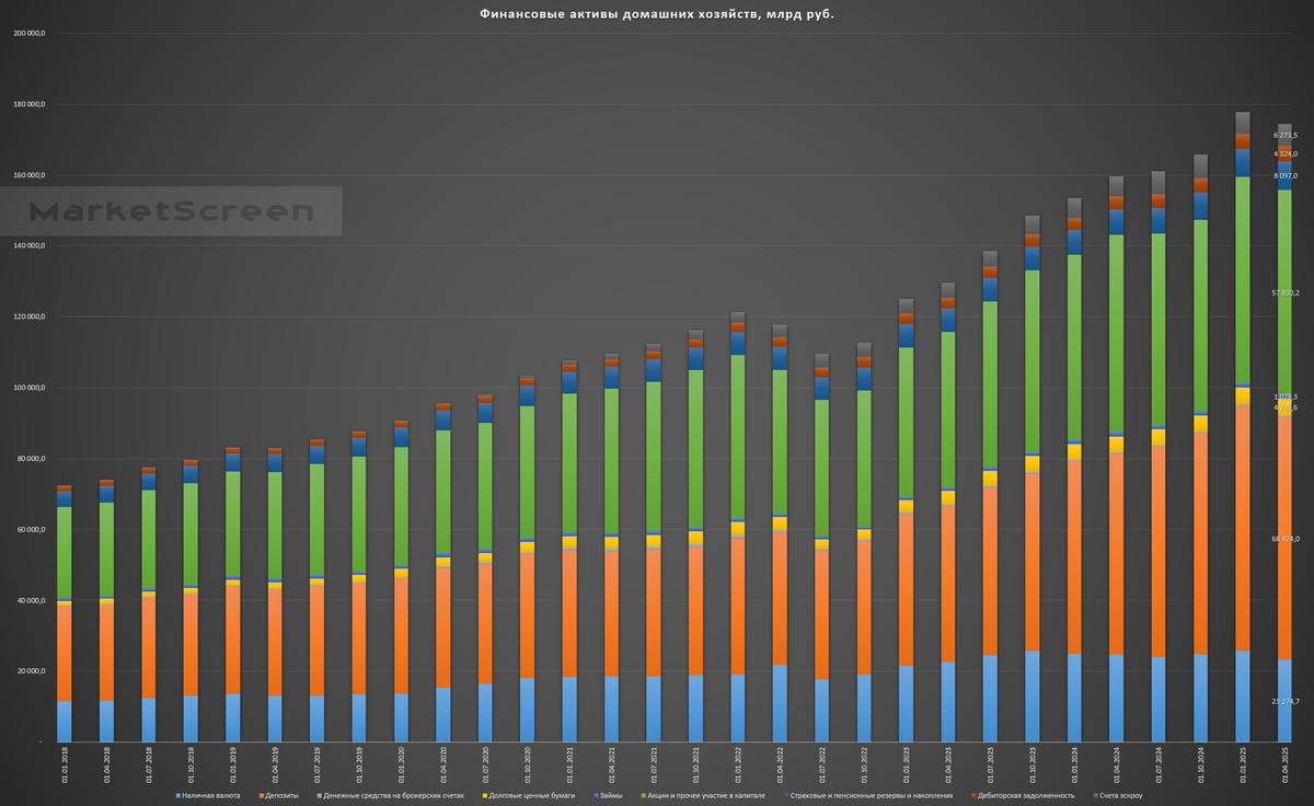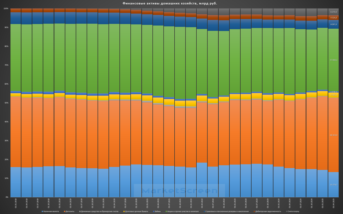 На первых двух картинках я даю динамику в номинале и динамику по структуре. Т.е. очевидно снижение доли нала, повышение доли депозитов и эскроу. По акциям невнятное. В номинале, конечно, хорошо выросло, а вот в относительных частях 2022 немного вернул ситуацию взад.