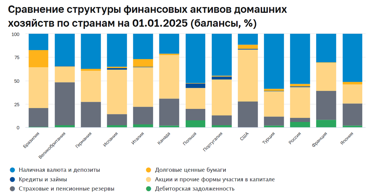 Третья картинка – сравнение структуры с рядом зарубежных стран. Мы сильно похожи на турков. В просвещенных же странах сильно развиты пенсионные и страховые накопления.