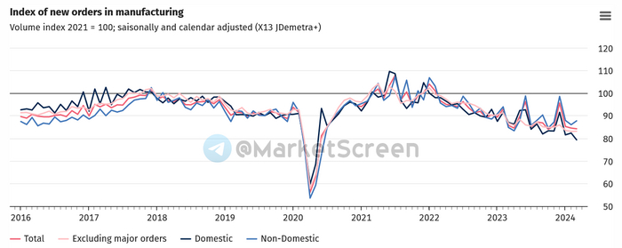Совокупный объем заказов германских промпредприятий в марте уменьшился на 1,9% по сравнению с тем же месяцем 2023 года (-8,8% в феврале).