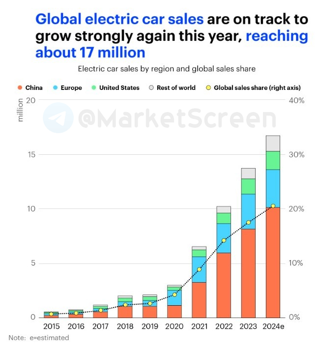 ▪️ По прогнозам, в 2024 году продажи электромобилей в Китае вырастут примерно до 10 миллионов, что составит около 45% от всех продаж автомобилей в стране. В США примерно каждый девятый проданный автомобиль должен быть электрическим.