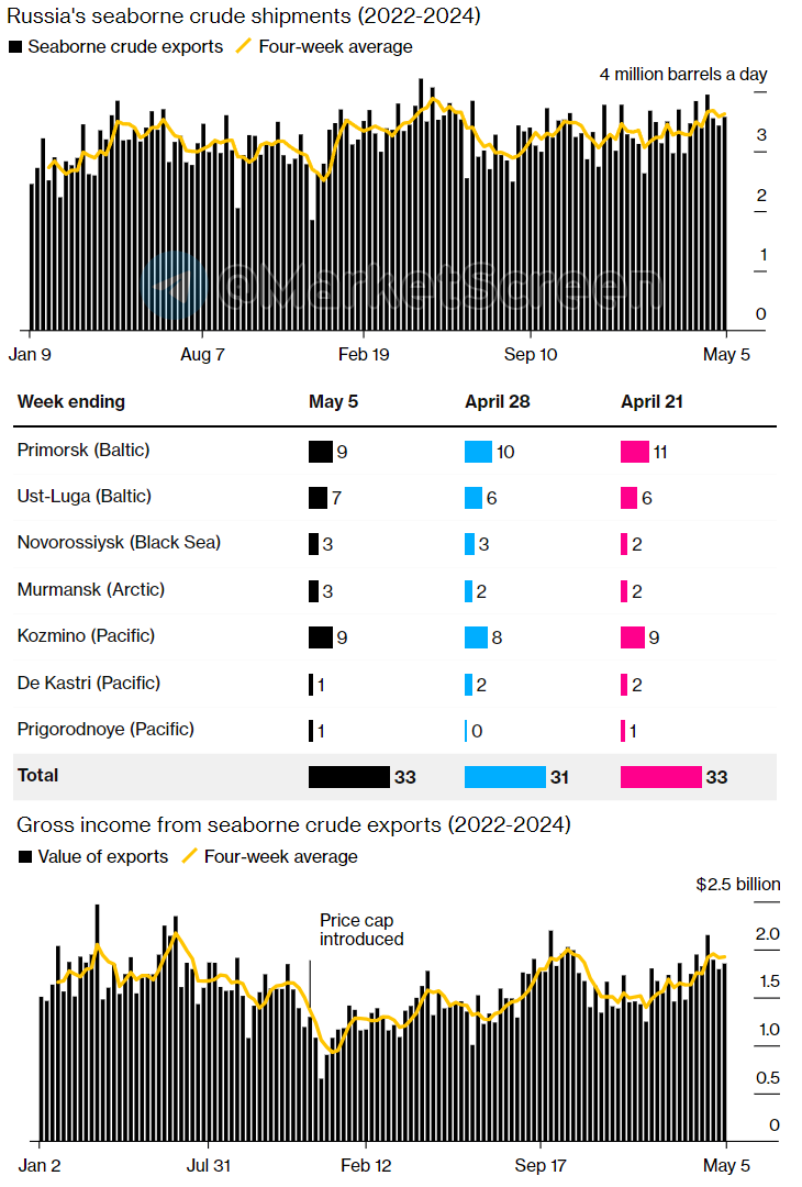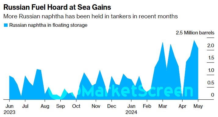 По данным аналитической компании Kpler, более 2 миллионов баррелей российской нафты, уже более недели хранятся в танкерах, часть из которых находится в водах вблизи Омана, по состоянию на 5 мая. Это больше, чем в среднем за неделю (около 790 000 баррелей) в январе и феврале.