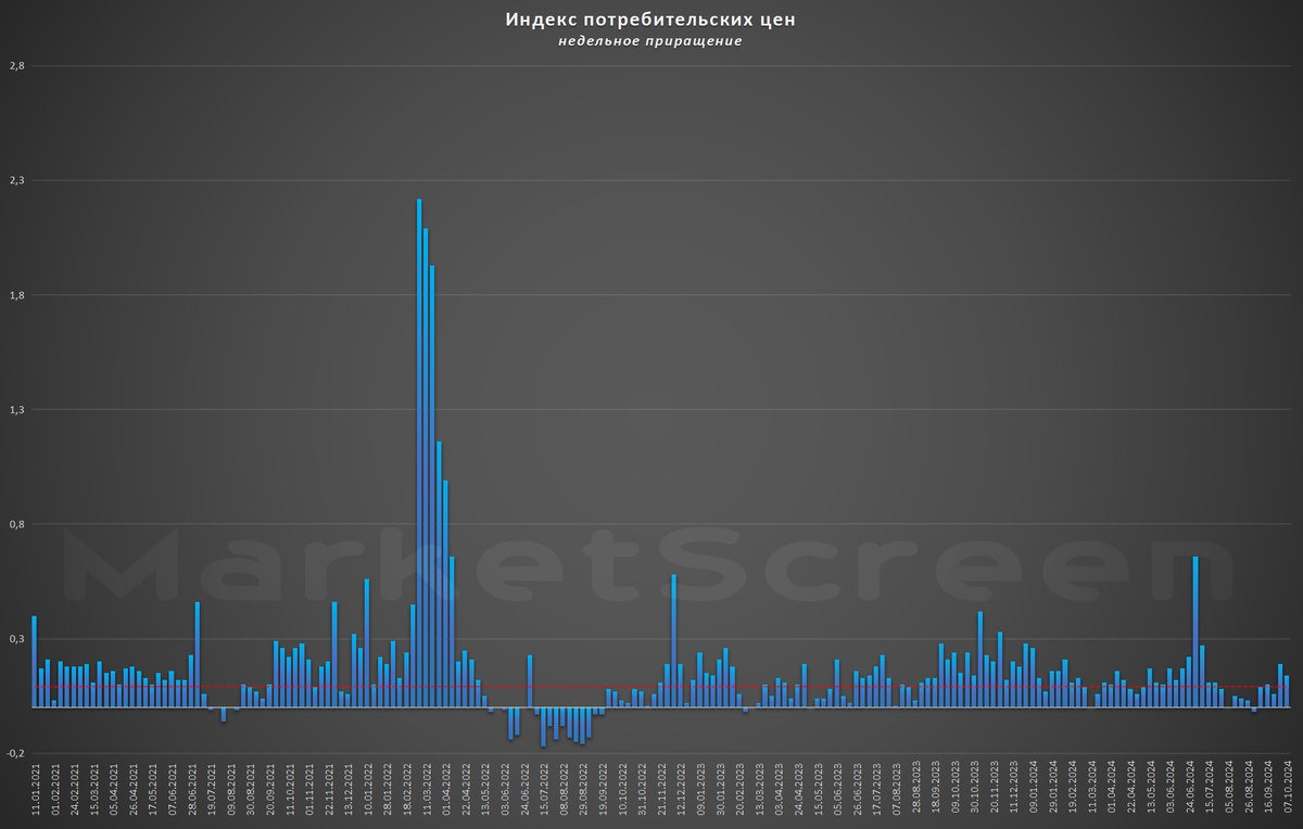 Напомню, при целях по годовой инфляции в 4-4,5% недельный прирост цен должен быть на уровне 0,08-0,09%.