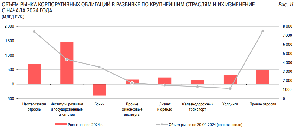 С начала года объем рынка корпоративных облигаций вырос на 3,1 трлн руб. (по непогашенному номиналу – на 2,6 трлн руб.), или 12,3% в относительном выражении, основной рост рынка происходил за счет институтов развития и государственных агентств, разместивших облигаций на общую сумму 1,5 трлн руб. (47,1% от всего размещенного объема ценных бумаг), из них треть пришлась на ипотечные облигации.