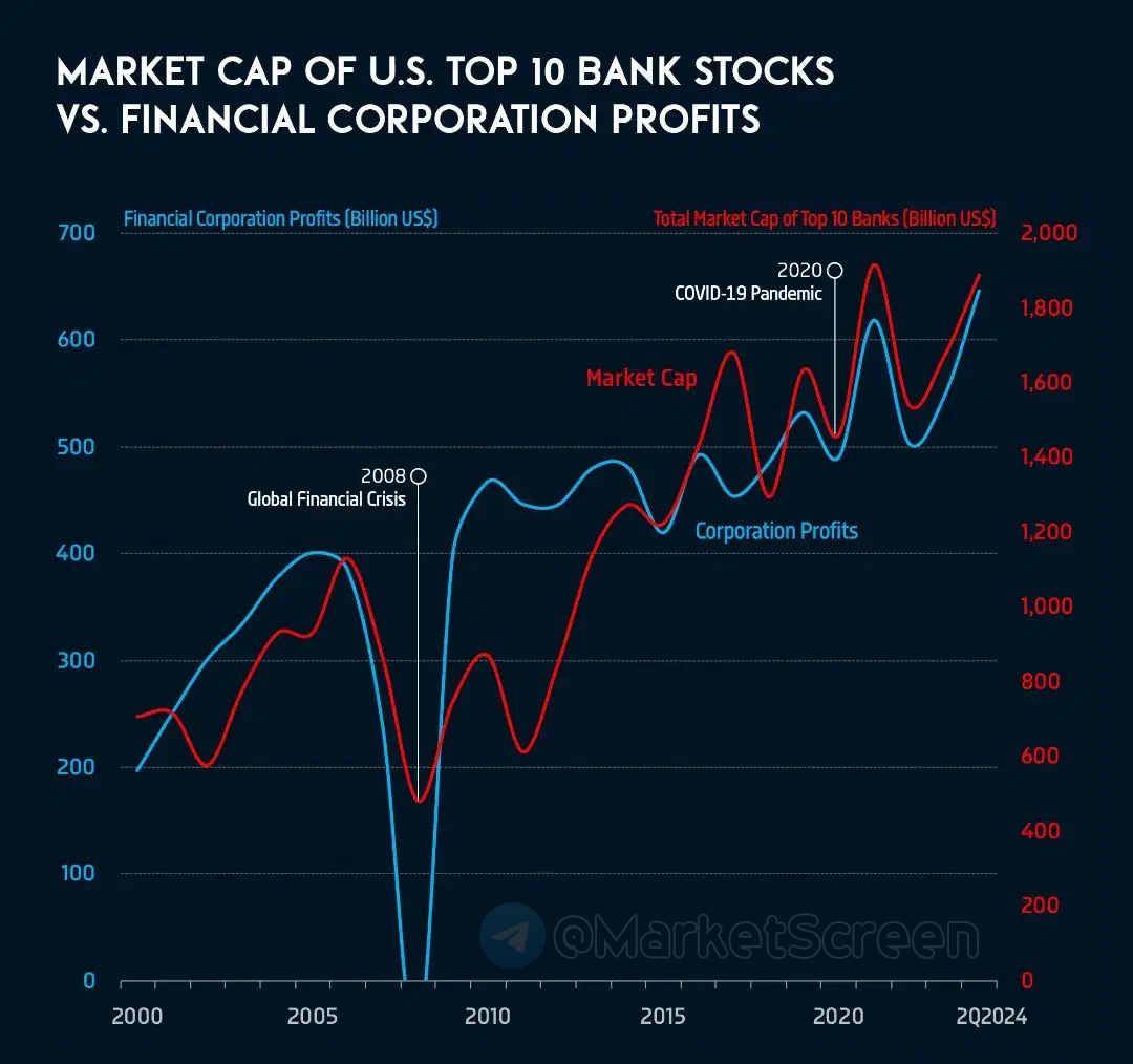 Рыночная капитализация 10 крупнейших банков США в целом отражает динамику прибылей финансовых корпораций. В период с 2000-2003 годов по 2 квартал 2024 года рыночная капитализация росла в годовом исчислении на 4,7%, что немного уступало годовому темпу роста прибыли финансовых корпораций США на 4,3%.