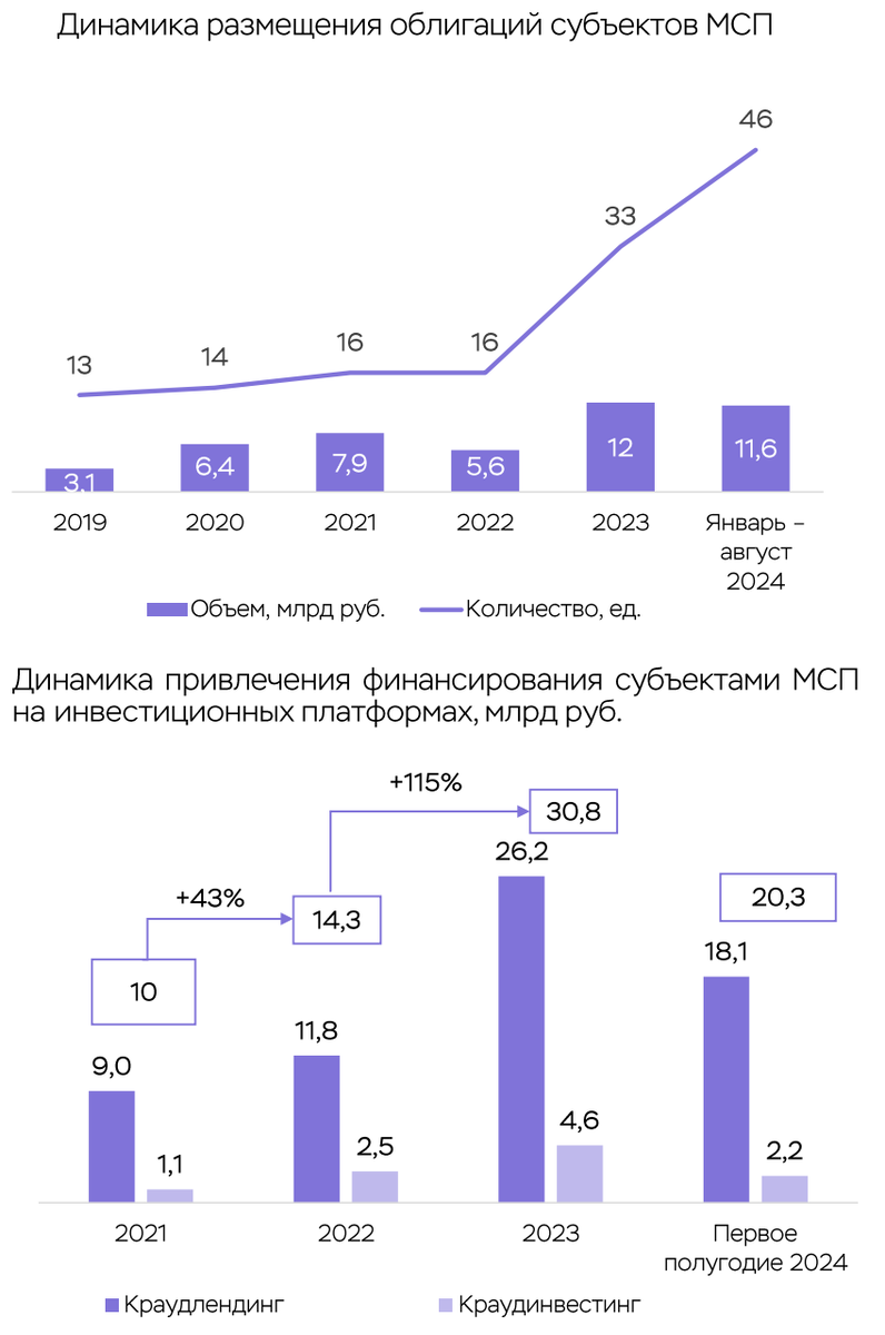 Также всё чаще стали прибегать к услугам инвестиционных площадок. За первое полугодие 2024 посредством краудлендинга собрано 18,1 млрд ₽ ( за весь 2023 – 26,2 млрд), с помощью краудинвестинга 2,2 млрд ₽ (4,6 млрд).