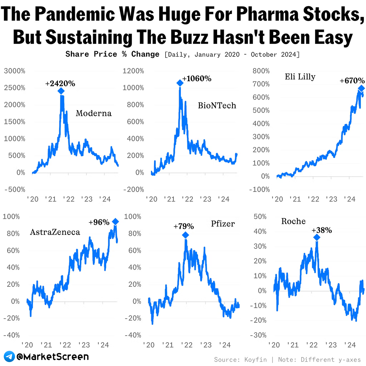 На картинке 6 известных фармацевтических компаний. Точнее, динамика стоимости их акций за период январь 2020 – октябрь 2024.