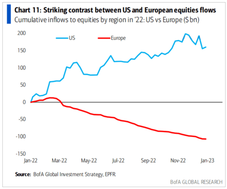 Это кумулятивный поток в фонды акций США и Европы за прошлый год. И вот... из фондов, инвестирующих в Европы деньги выводили планомерно. 100 млрд.$ на конец года.