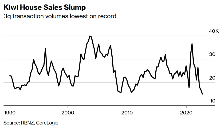 Продажи недвижимости в Новой Зеландии по результатам 3 квартала рекордно упали. Всего 14966 штук. Это ниже уровня 2008 года. Собственно, это самый низкий уровень за всю историю наблюдений.